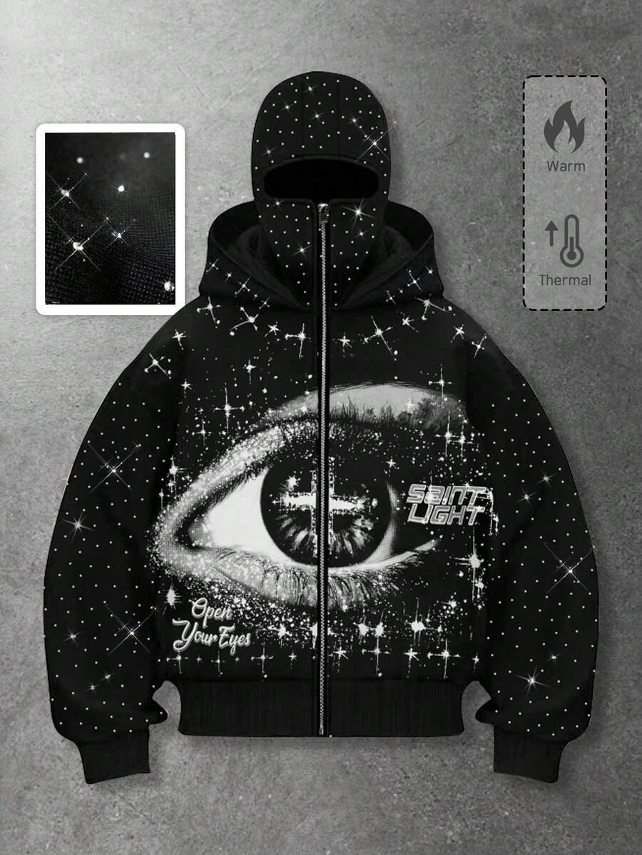 Street Life Sweat à capuche zippé pour hommes, style punk de rue, imprimé graphique avec ornements de strass. Top à manches longues, automne/hiver