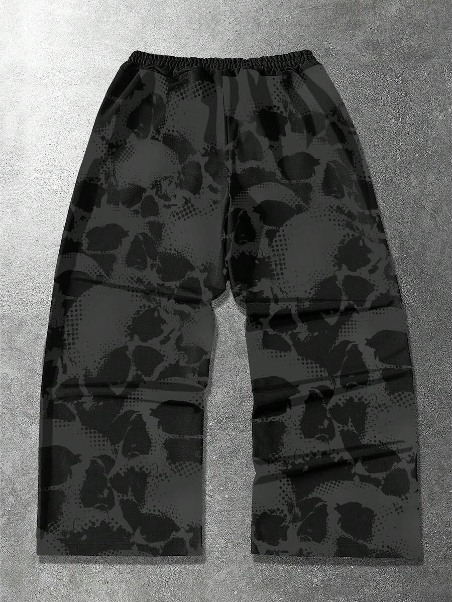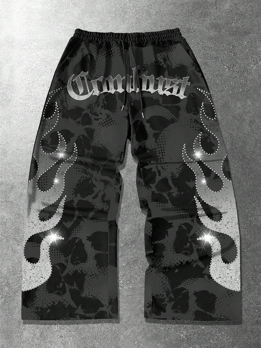 Pantalon de survêtement ample à taille coulissante avec imprimé numérique flamme gris brillant et blanc pour hommes