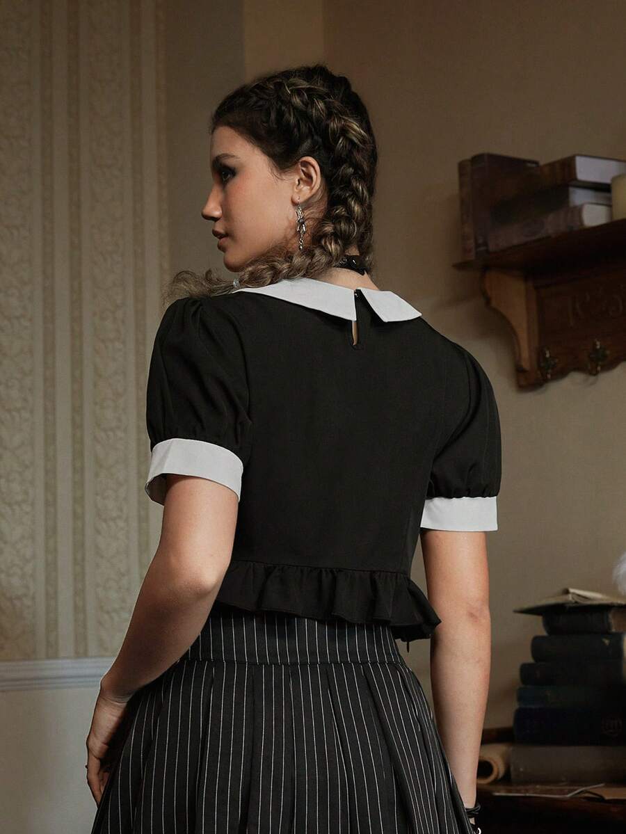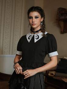 Goth Blouse Imprimé Lune À Col Contrastant À Volants
