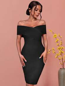 Robe cocktail bandage col bardot croisé dos-nu zippé moulant fête