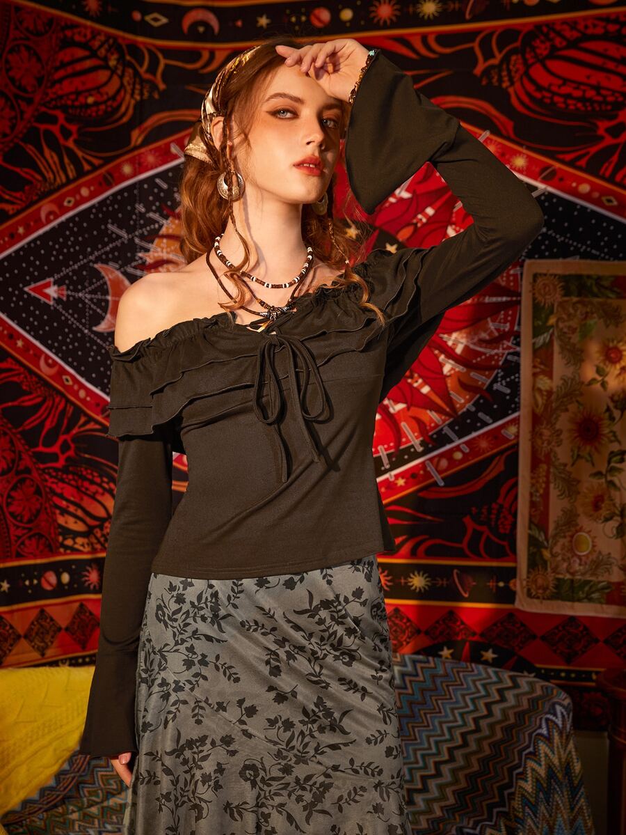 T-shirt col bardot à plis manches évasées