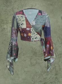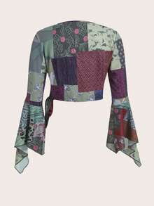 Hippie Blouse Imprimé Patchwork À Manche Évasée À Nœud