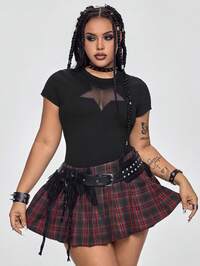 Paul Frank X ROMWE T-shirt à manches courtes pour femmes grande taille, style rétro Y2K avec imprimé lettres et damier