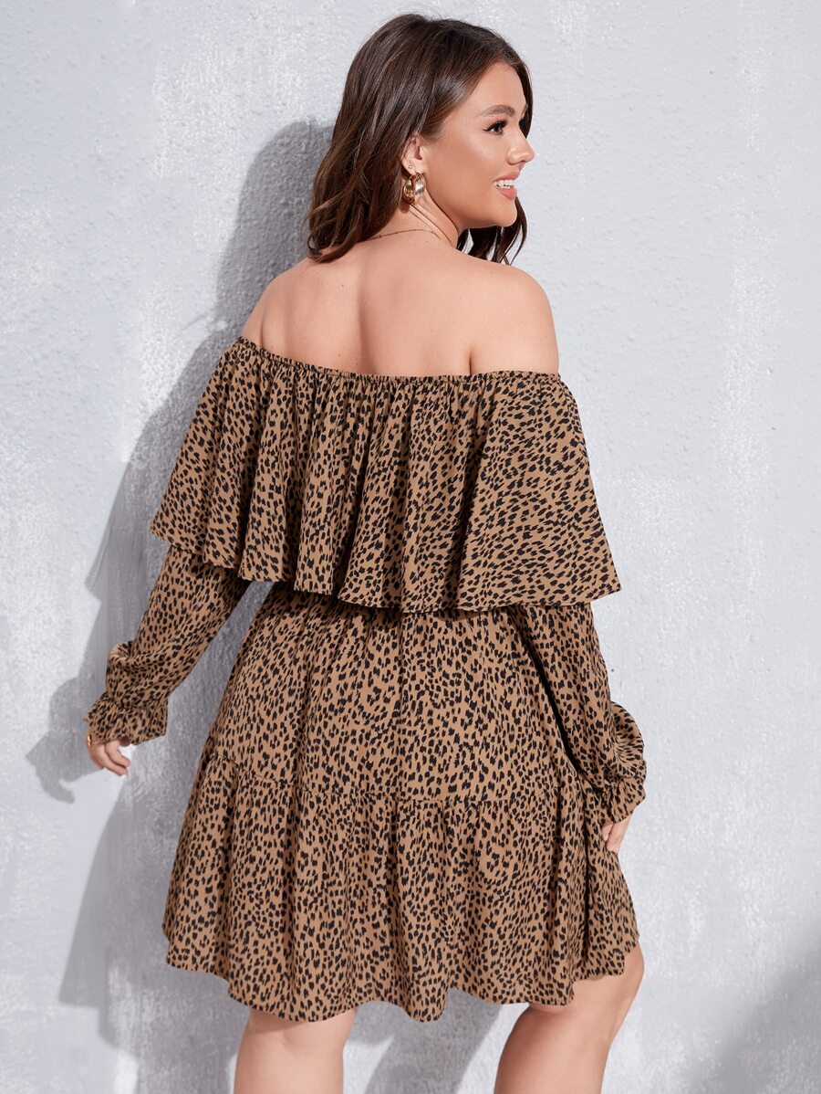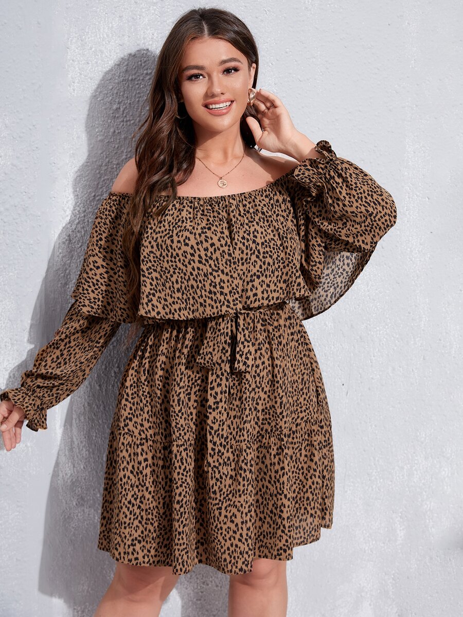 Robe ceinturée à imprimé col bardot à manches évasées à plis