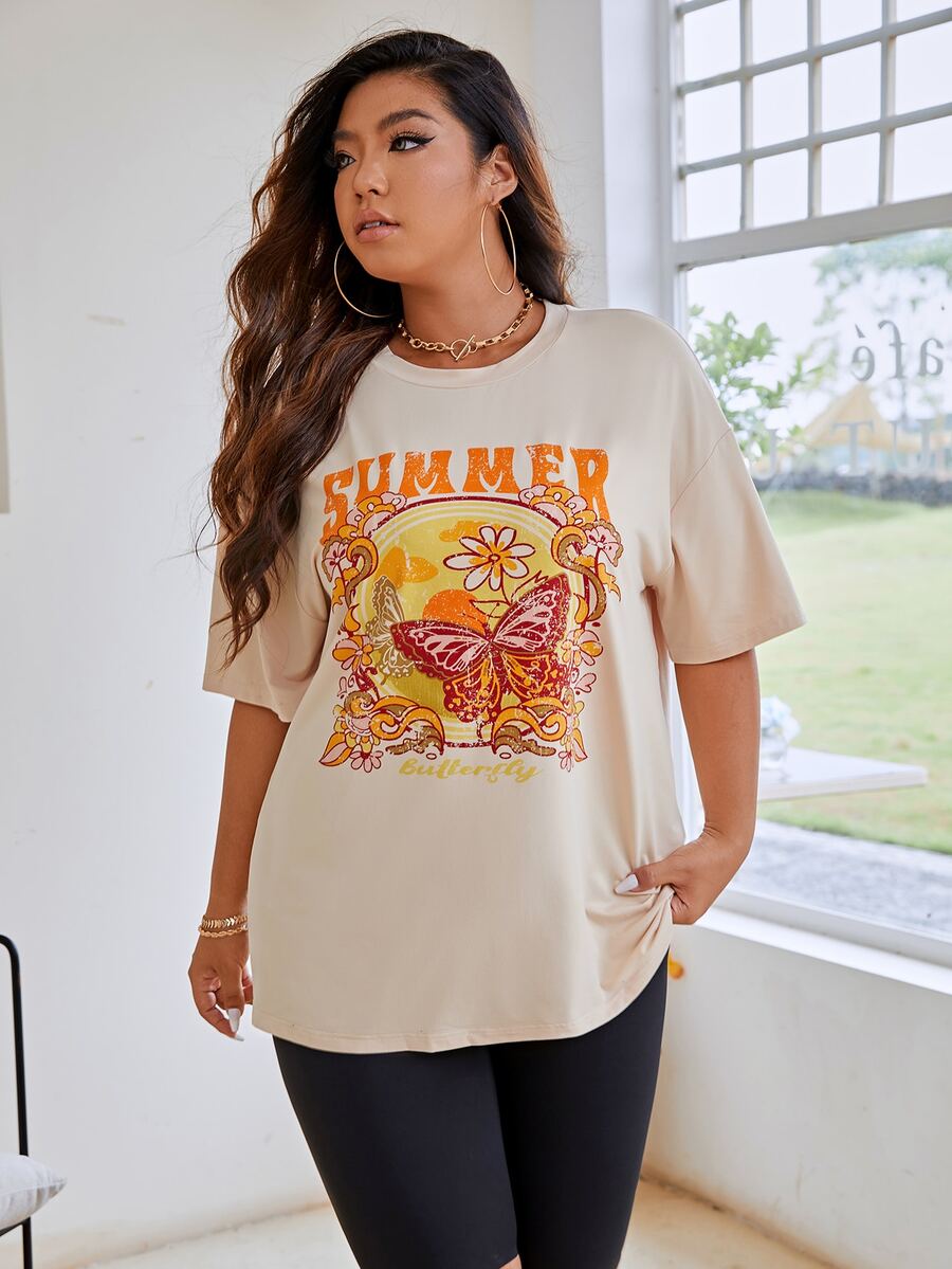 T-shirt ample à manches tombantes avec graphique papillon et lettres pour l'été