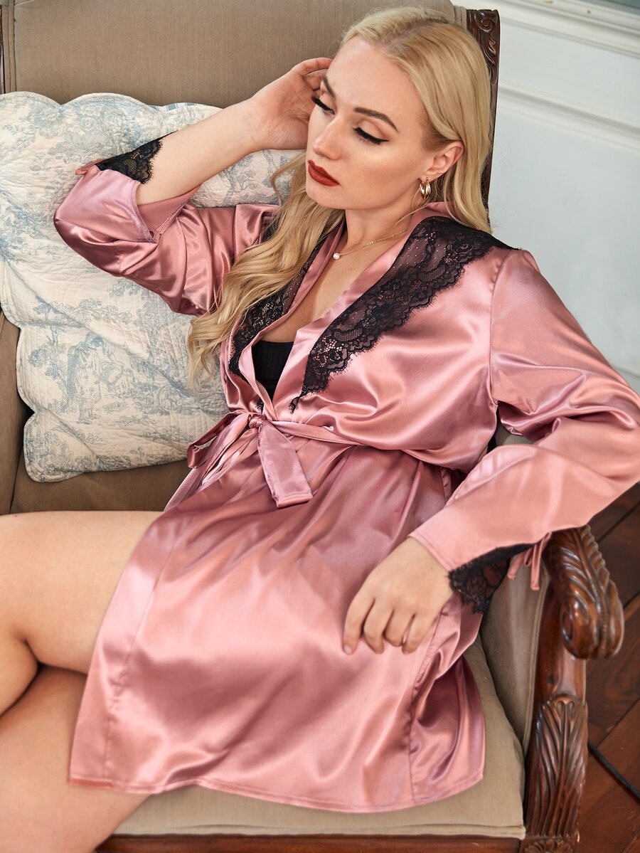 Peignoir ceinturé en satin avec dentelle