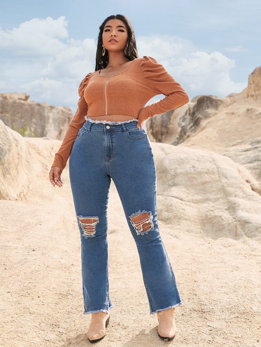 Jean évasé taille haute déchiré ourlet effiloché