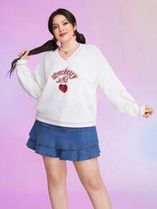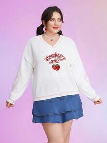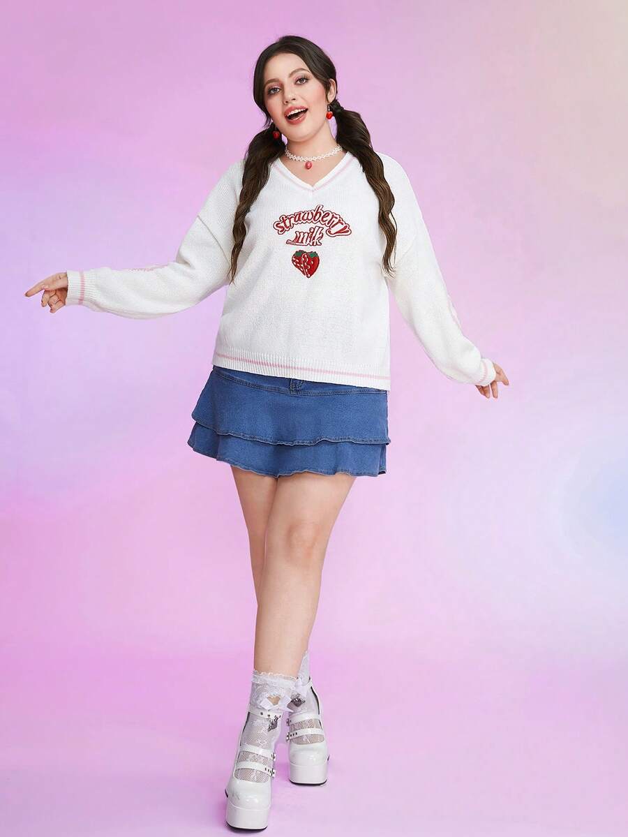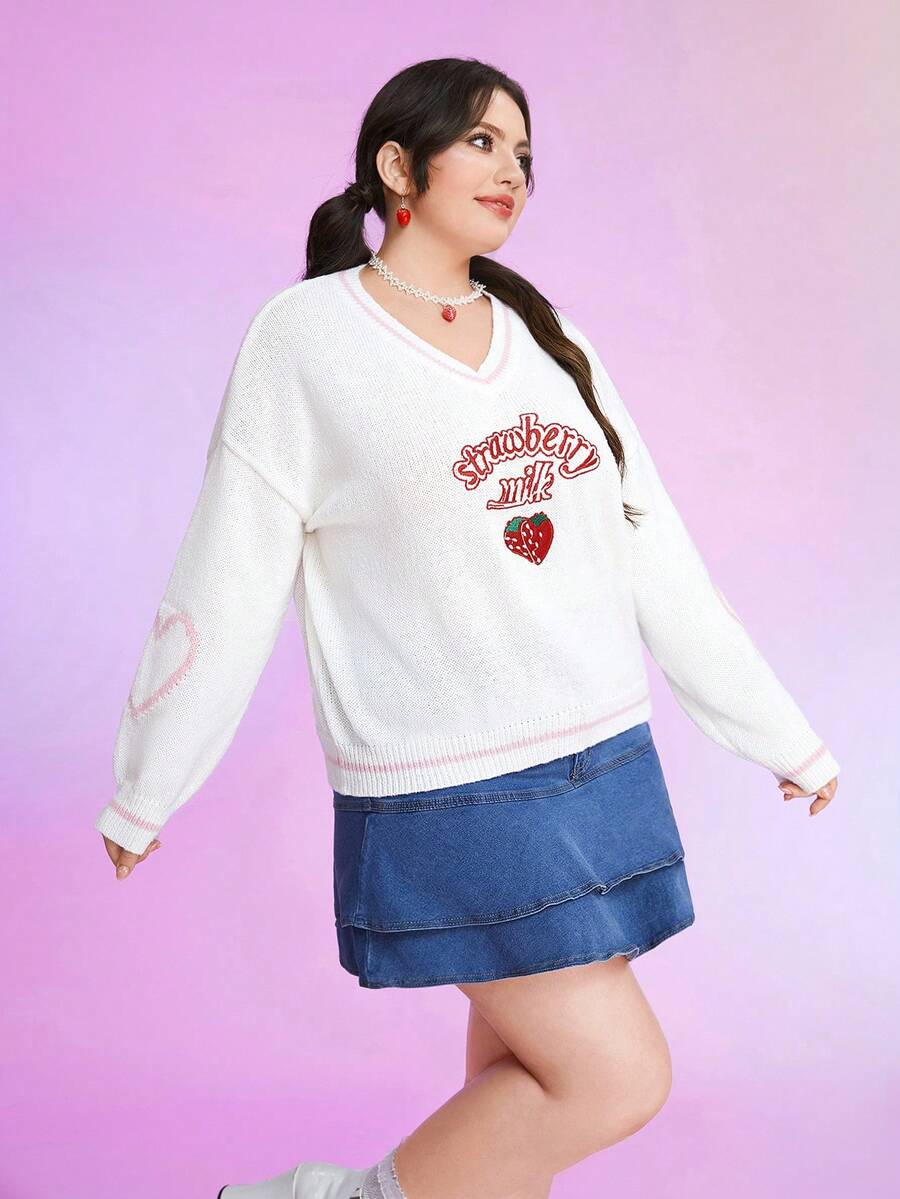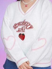Kawaii Plus Pull Lettre & À Broderie Fraise Épaule tombante