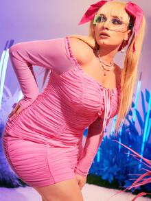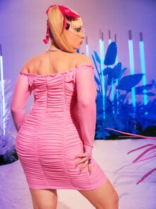 Robe moulante col bardot à plis à ruché