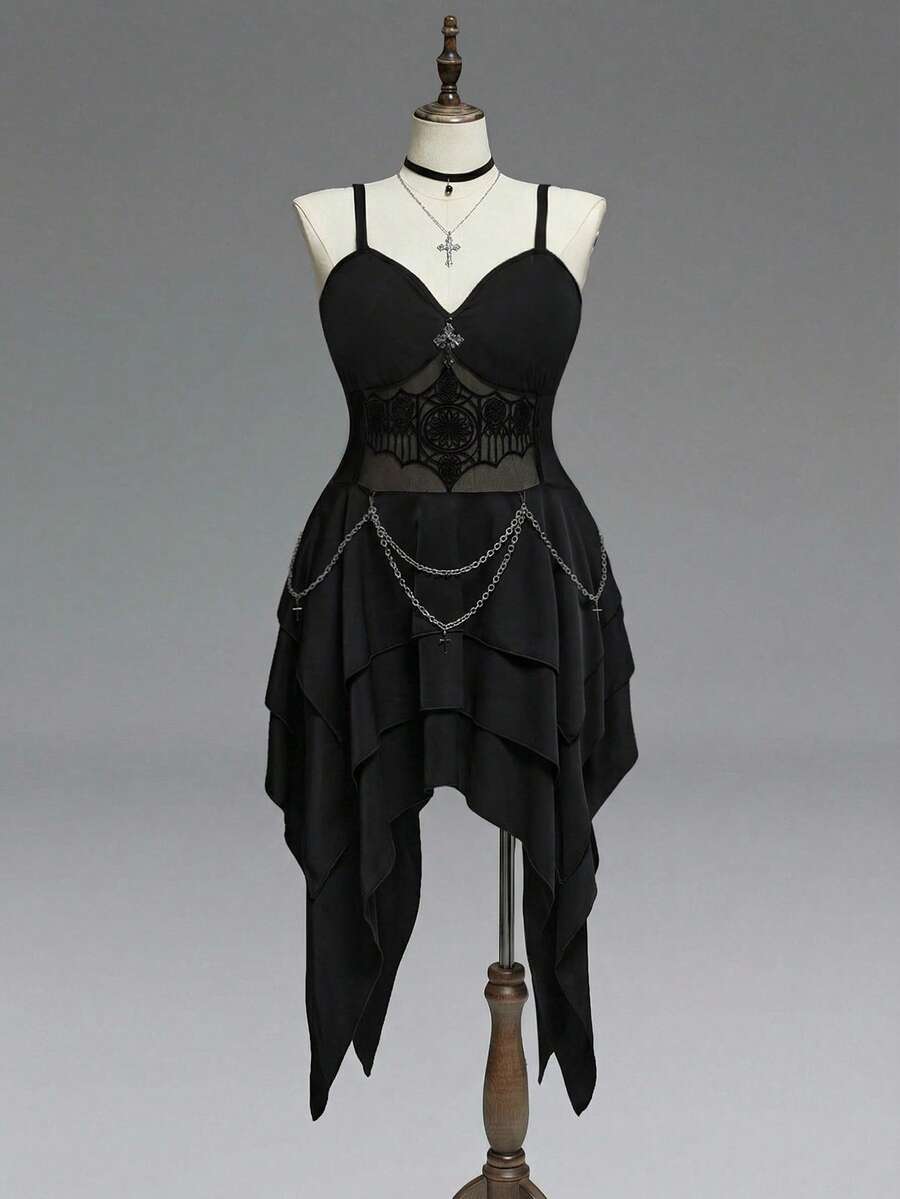 Robe gothique style grande taille avec fleurs découpées, broderie, ourlet asymétrique et chaîne métallique amovible à la taille pour femmes