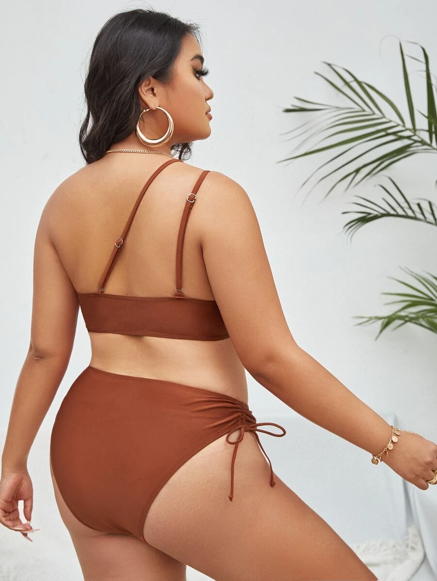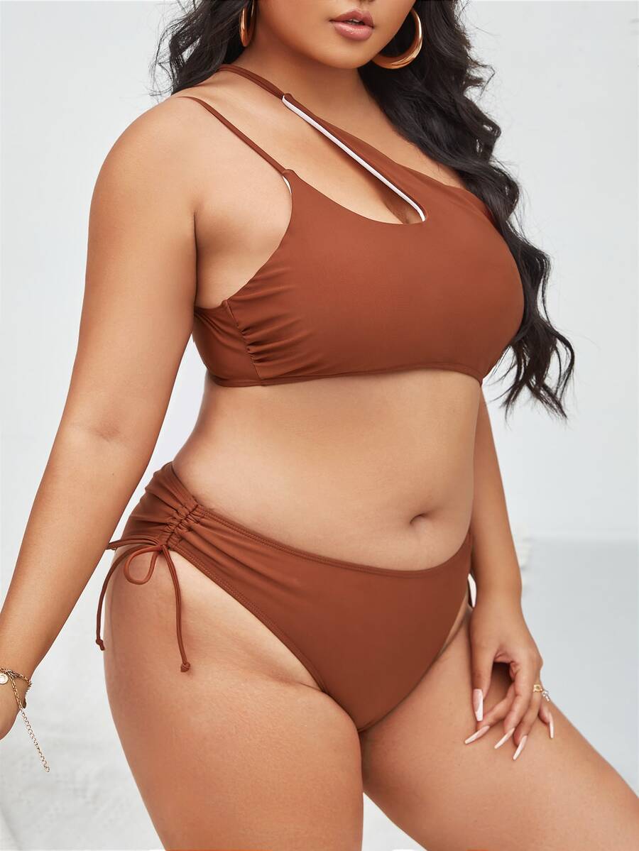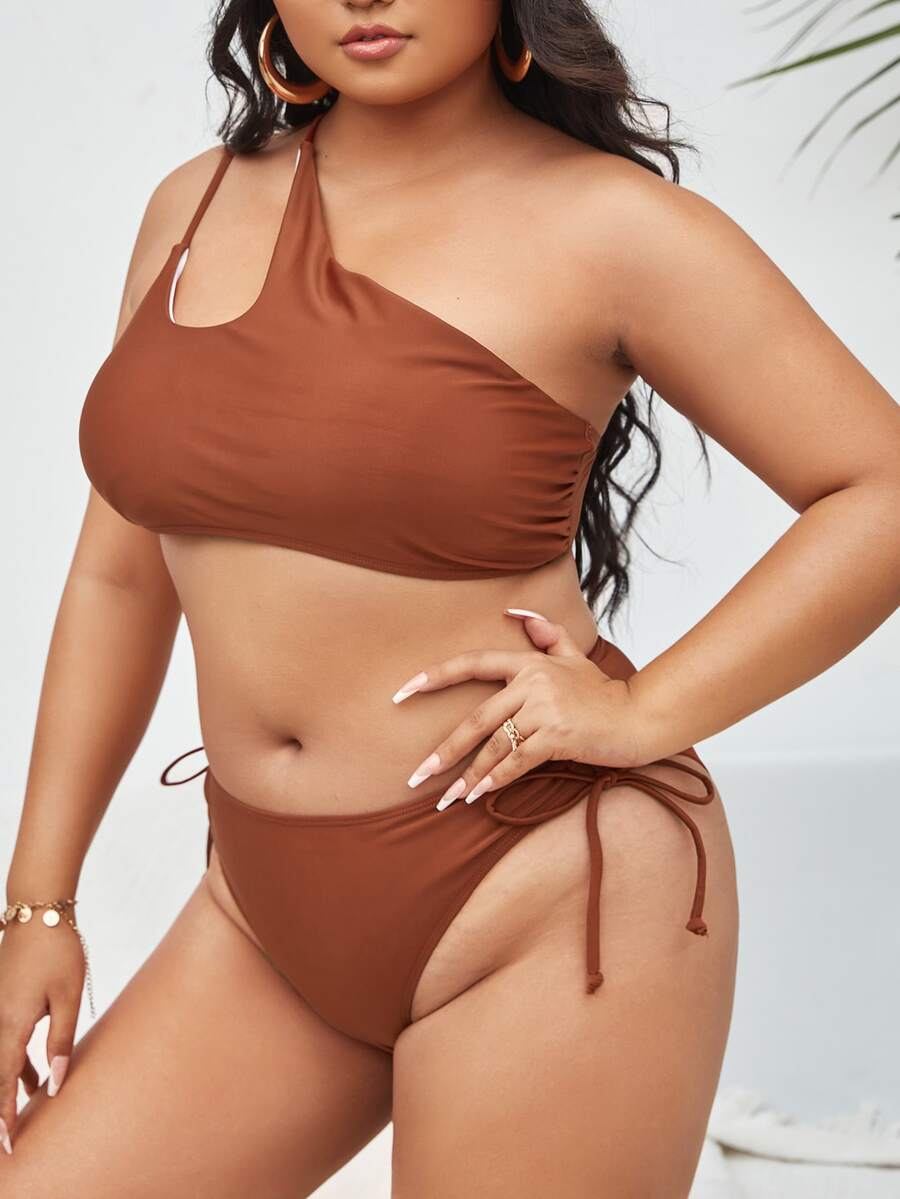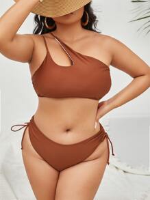 Ensemble bikini épaule nue grande taille avec nœud latéral, unicolore, pour plage d'été