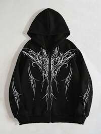 Sweat-shirt à capuche à manches longues, zip avant et cordon de serrage, imprimé gothique, grande taille pour femmes