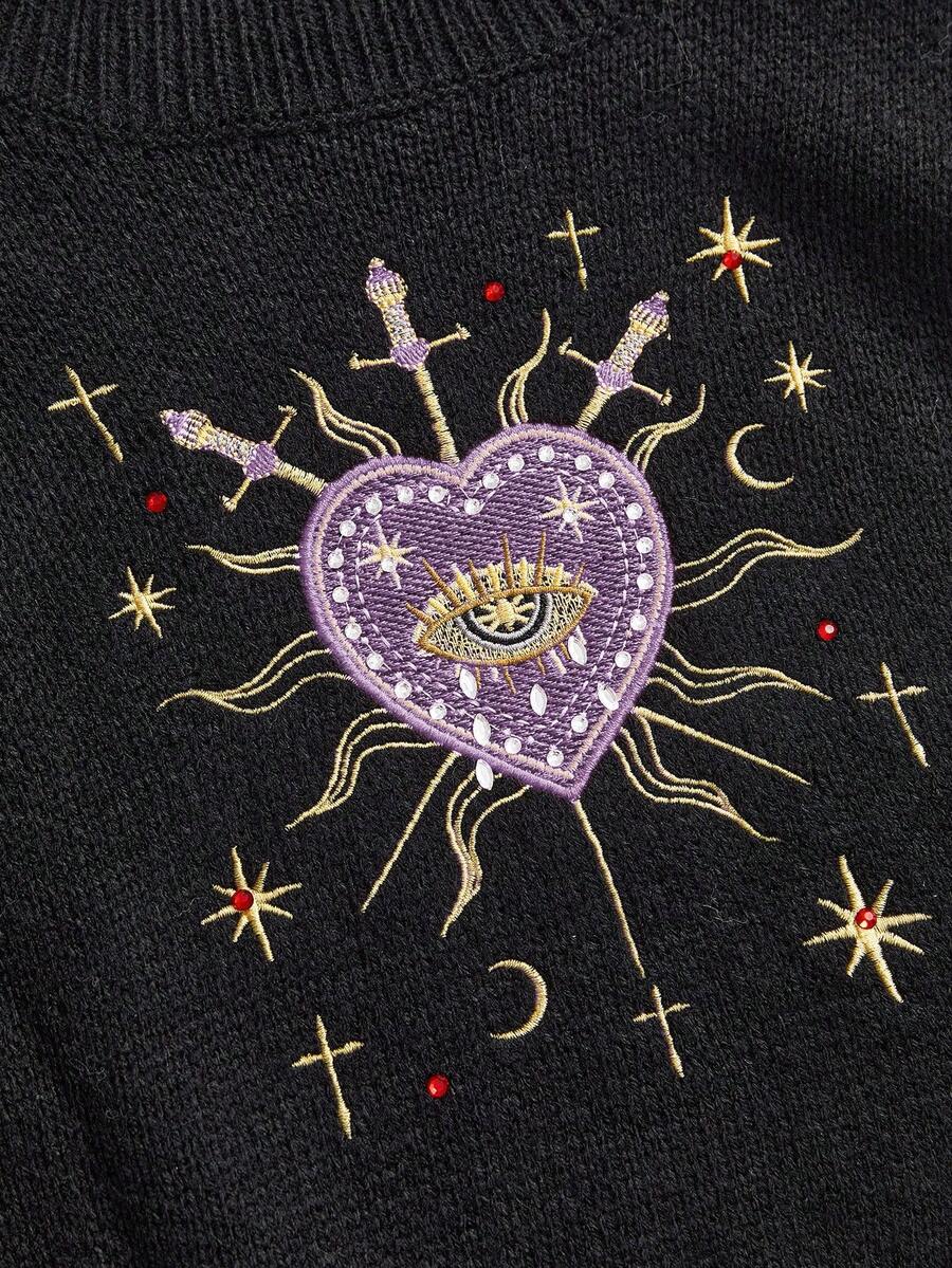 Pull col roulé grande taille pour femmes, style gothique romantique avec broderie de cœur, strass et cristaux, décoration d'étoile en forme de larme