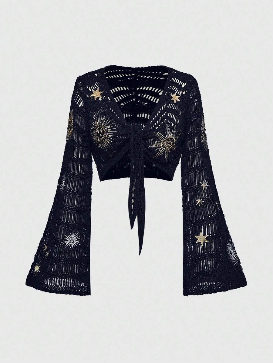 Cardigan style hippie brodé avec motif de lune et d'étoile, pour femmes grandes tailles. Cardigan tricoté bohème décontracté pour vacances, grandes tailles