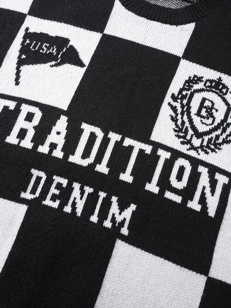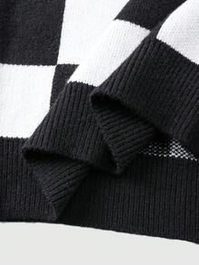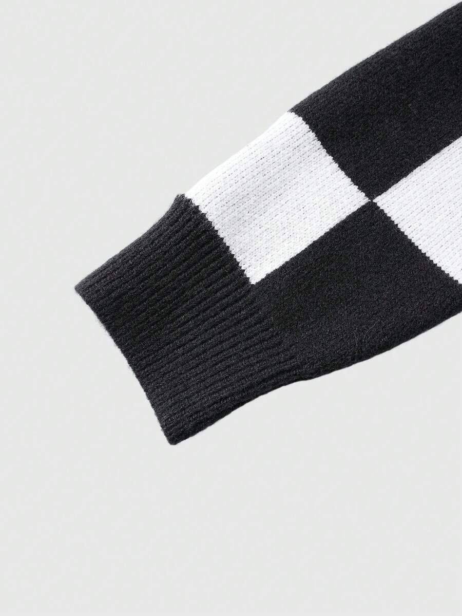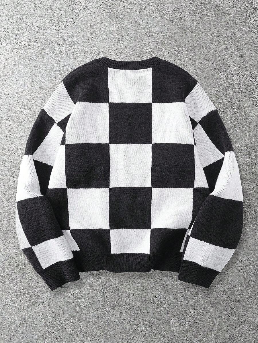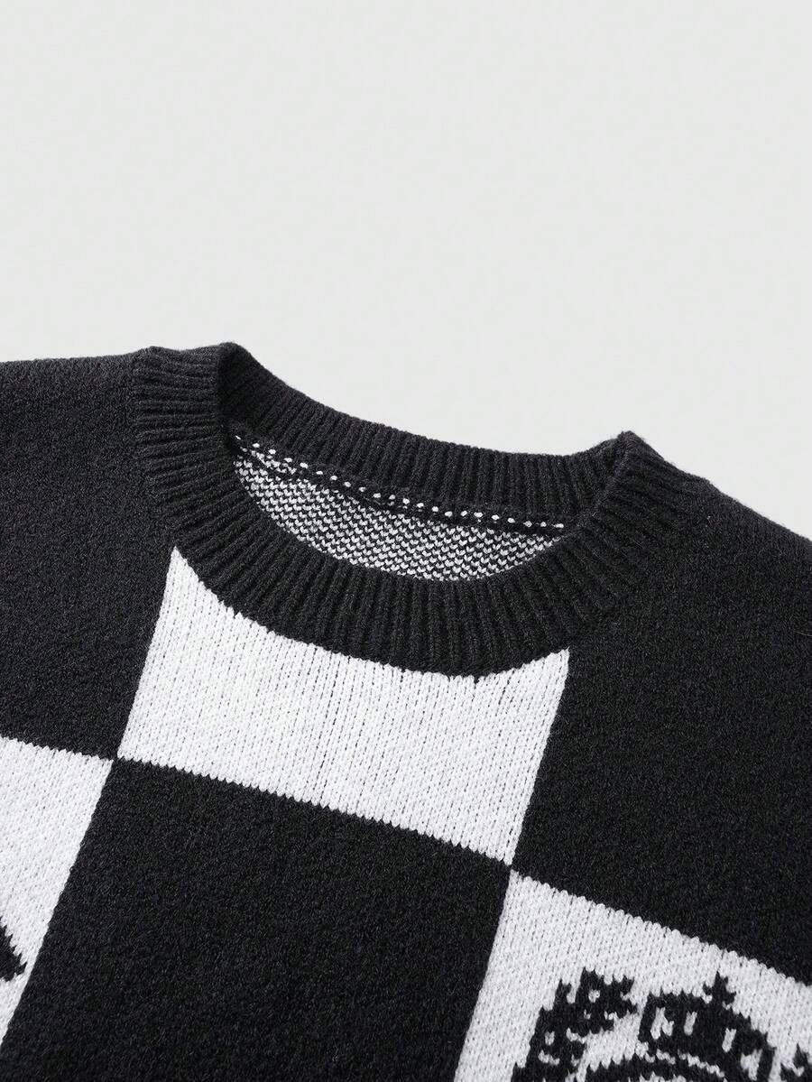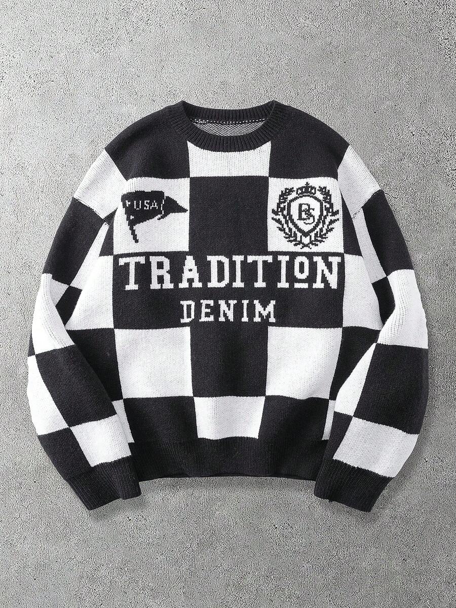 Prep Pull ample en tricot à motif de lettres en damier noir et blanc avec épaules tombantes, style mode de rue décontracté pour hommes, automne/hiver