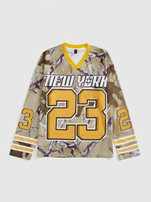 Prep T-shirt décontracté à manches longues col V avec imprimé numérique ample pour hommes