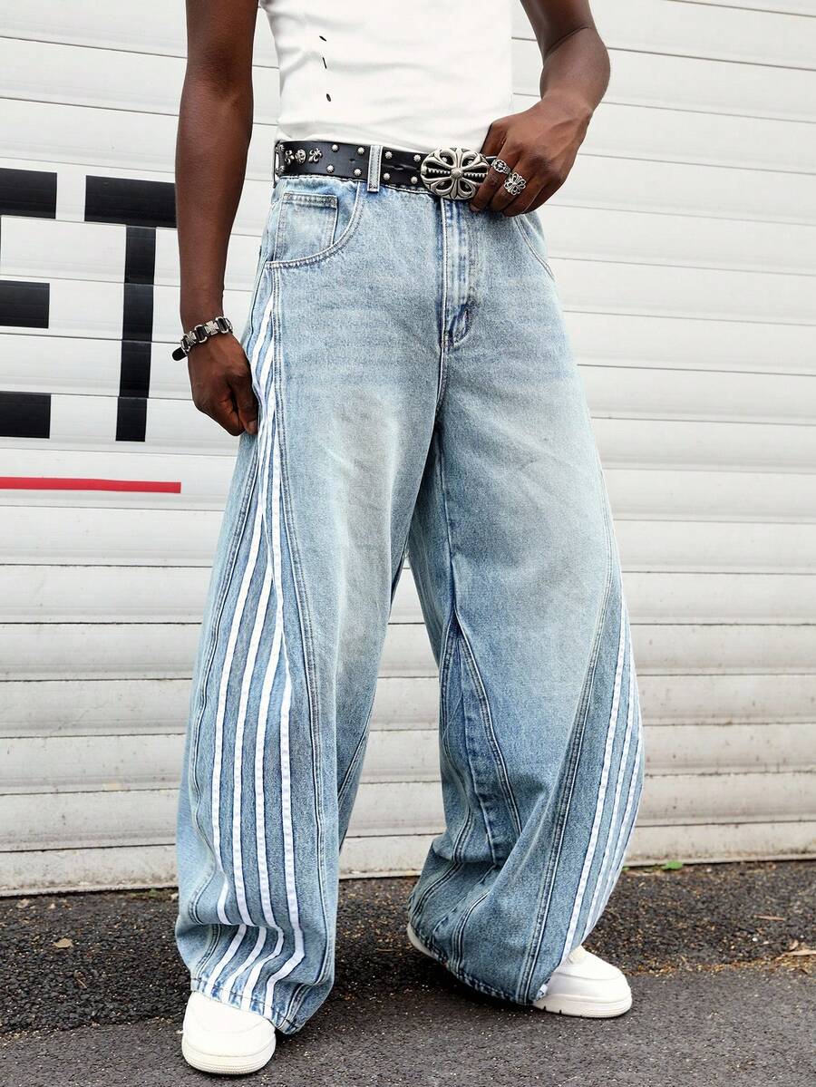 Prep Jeans décontractés coupe ample à jambes larges avec rayure latérale et poches pour hommes