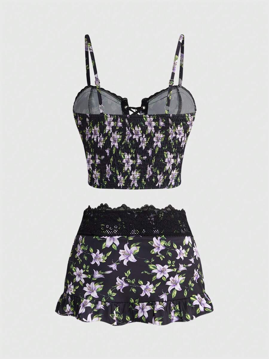 ROMWE Avant 2 pièces Ensemble charmant pour femme à imprimé floral pour vacances sur l'île, fête, rassemblement