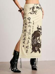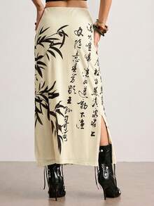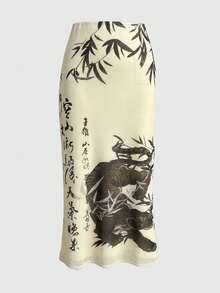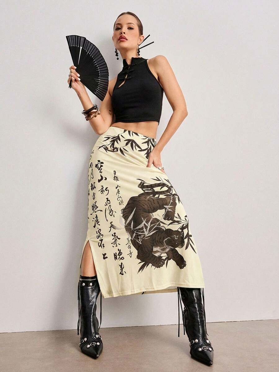 ROMWE Avant Jupe fendue pour femme avec imprimé calligraphique de tigre et de feuilles de bambou dans un style chinois