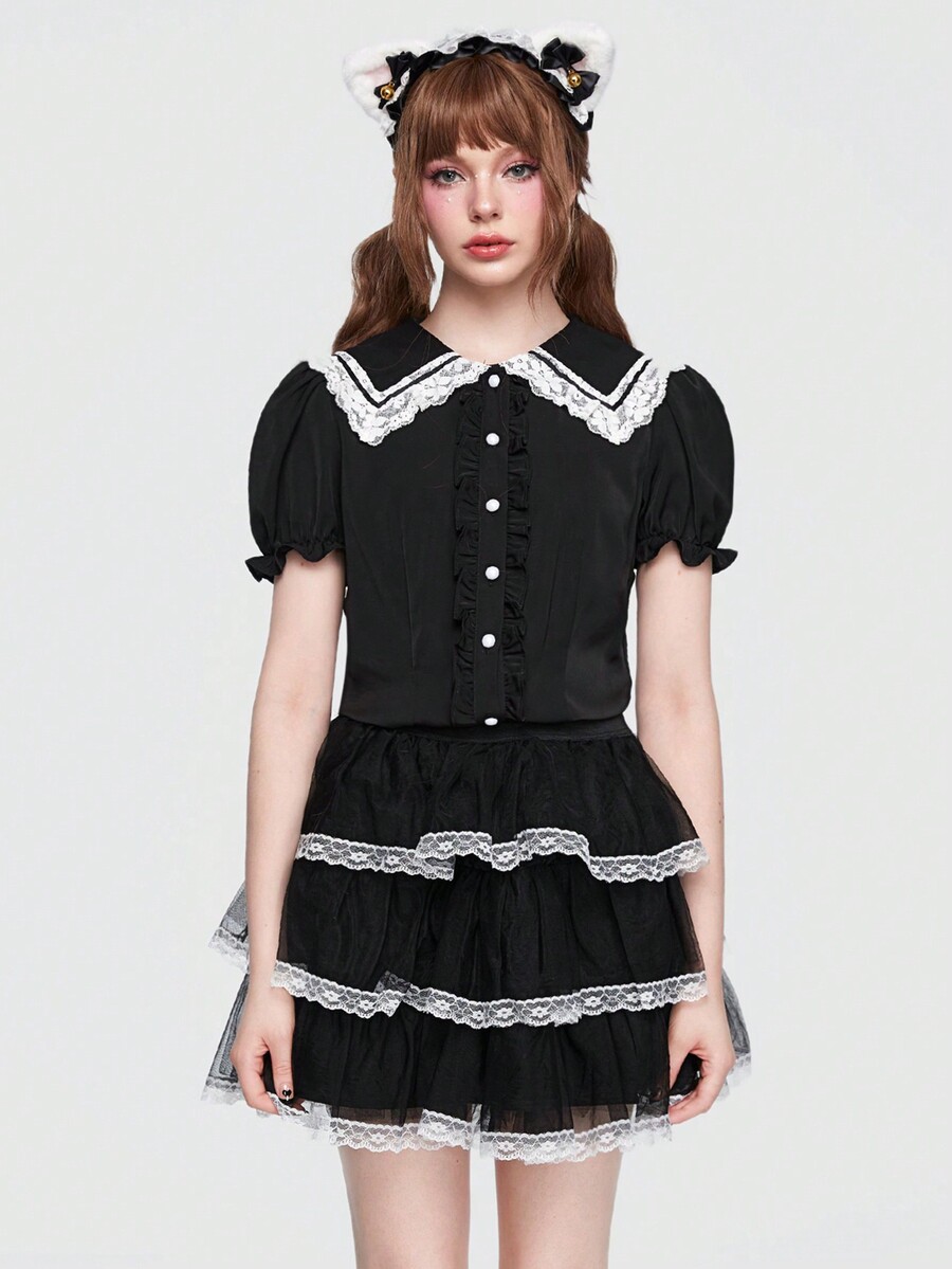 ROMWE Avant Chemise En Dentelle À Plis À Col Statement Manches Bouffantes