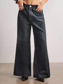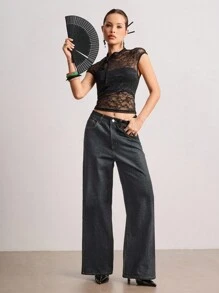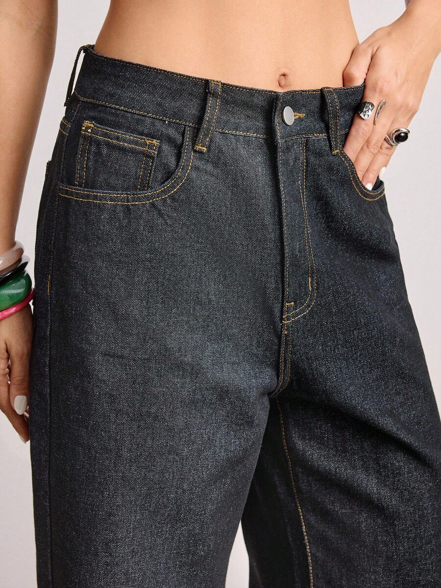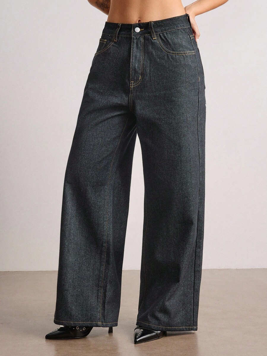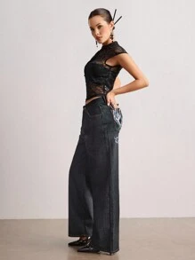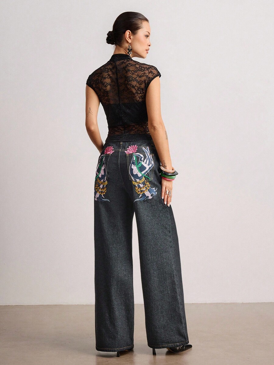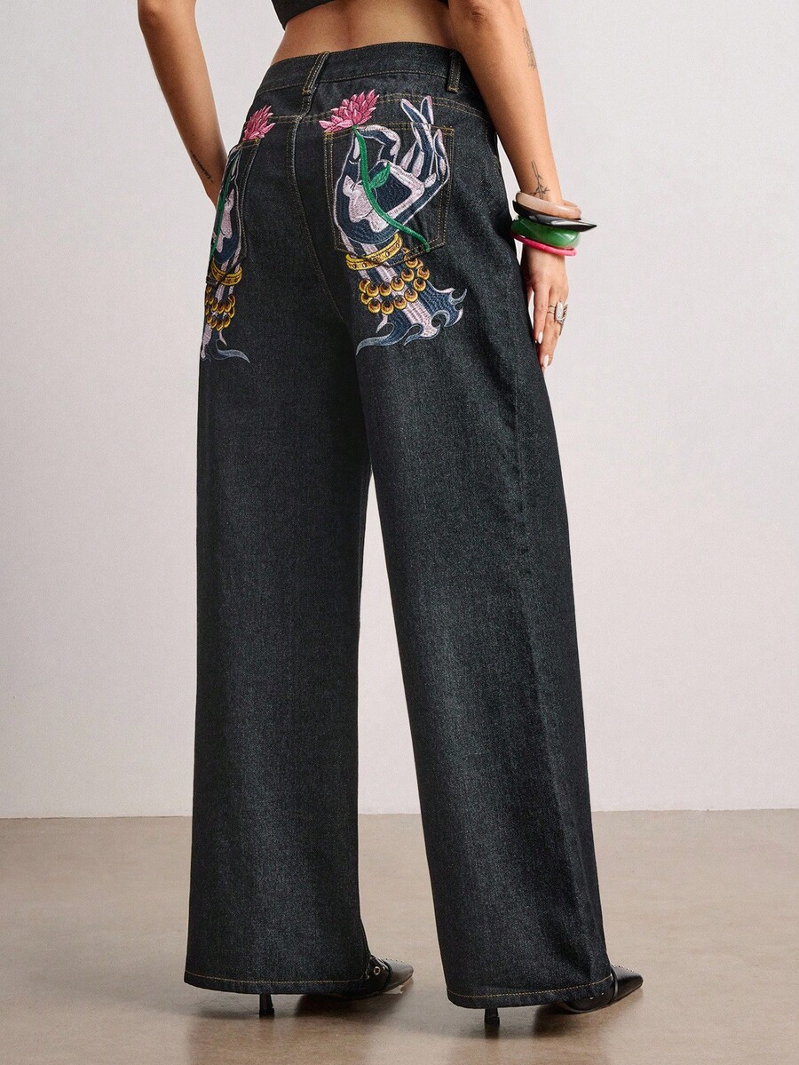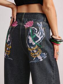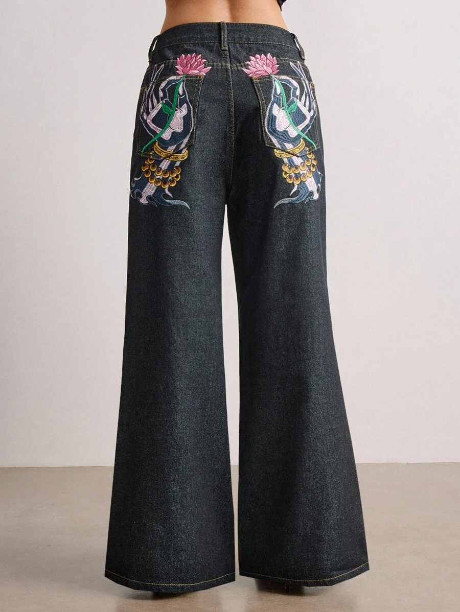 ROMWE Avant Nouveaux jeans larges pour femmes au style chinois avec broderie de lotus