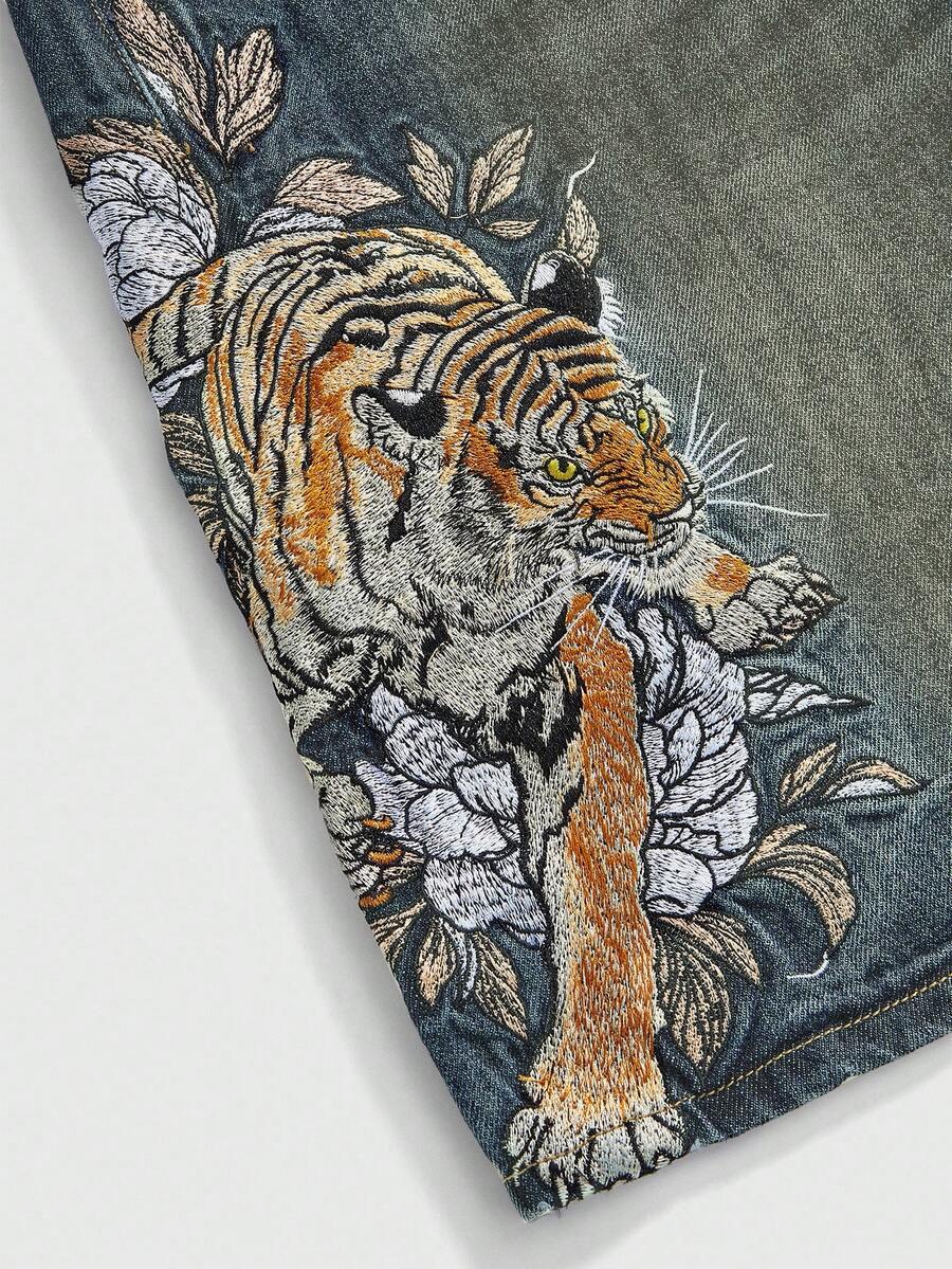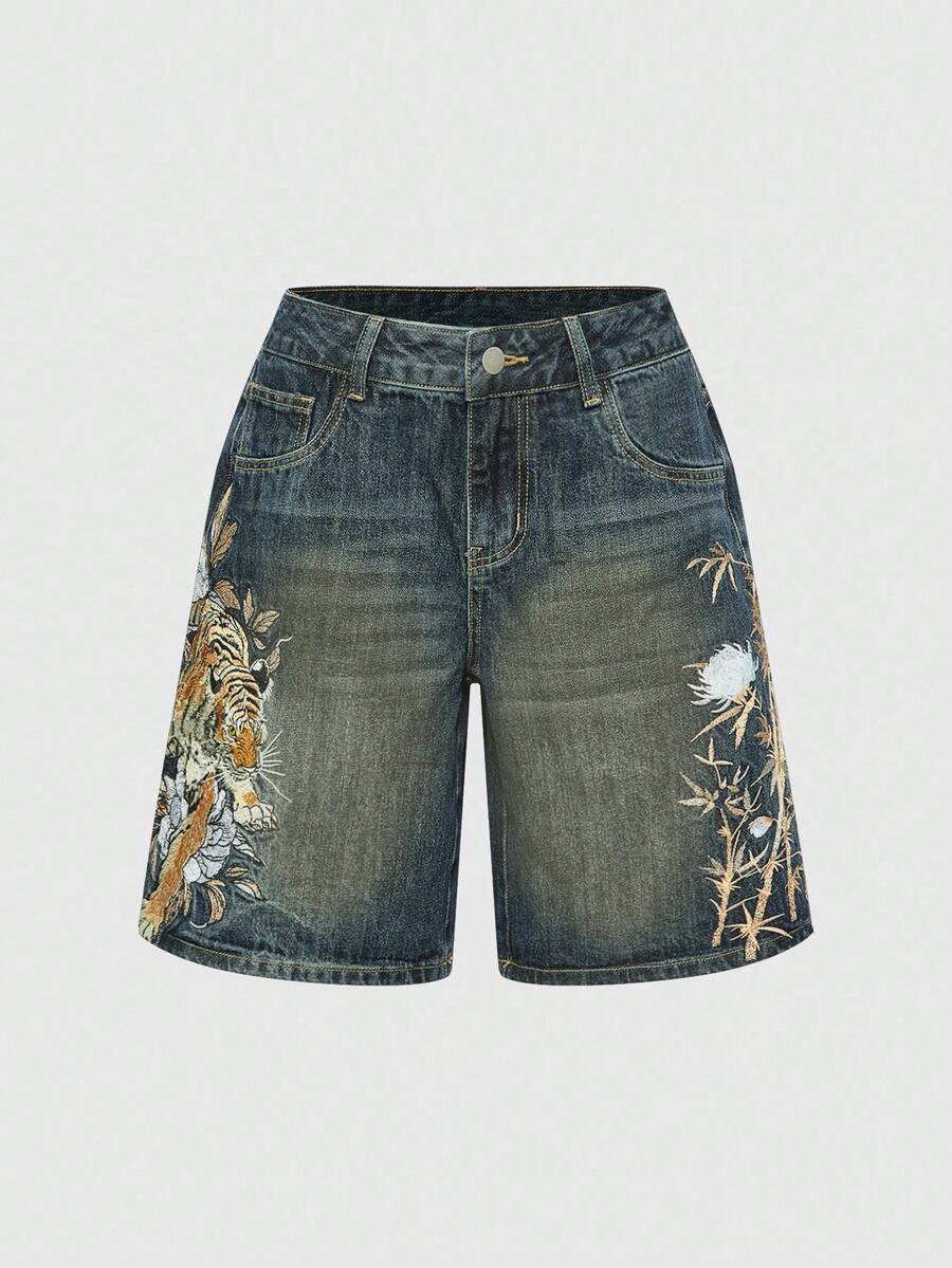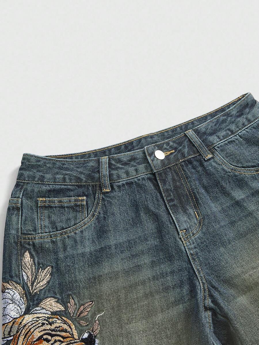ROMWE Avant Jeans unisexes à taille basse, coupe ample et style de rue rétro avec broderie de tigre et de fleurs chinoises