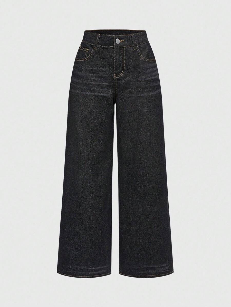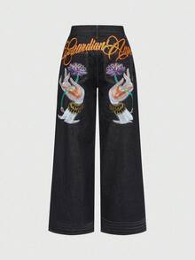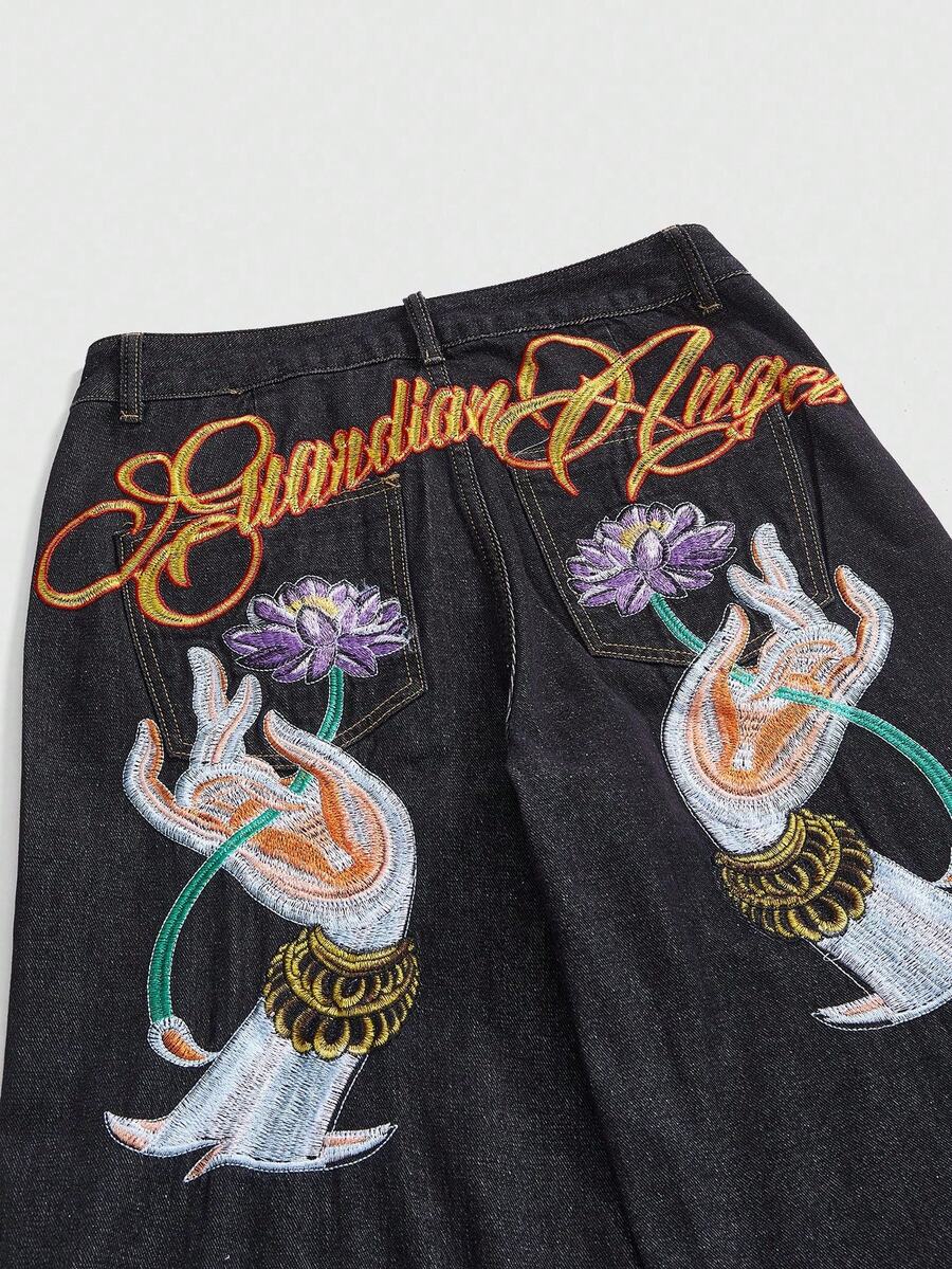 ROMWE Avant Jeans droits unisexes rétro Y2K style chinois de base avec broderie de lotus