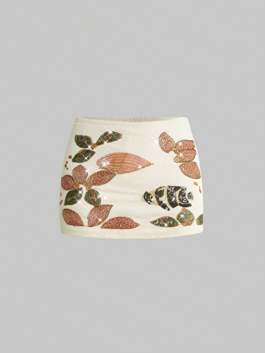 ROMWE Avant Jupe mini à taille basse avec broderie de poissons et étoiles de mer pailletés, tenue de vacances
