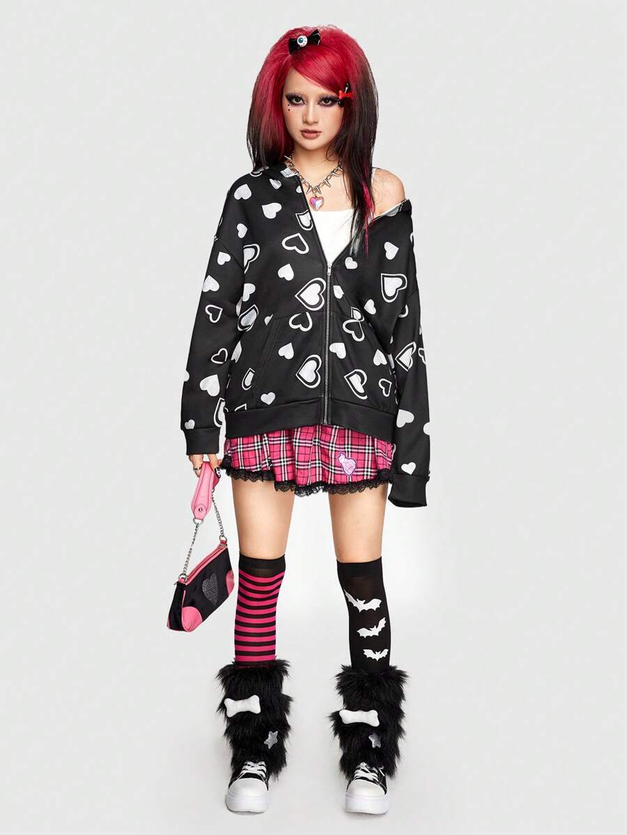 ROMWE Avant Sweat À Capuche Zippé En Forme De cœur À Imprimé Complet Pour Femmes