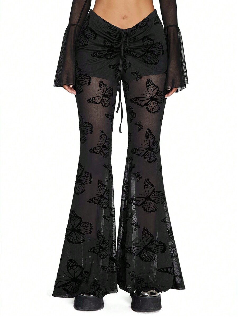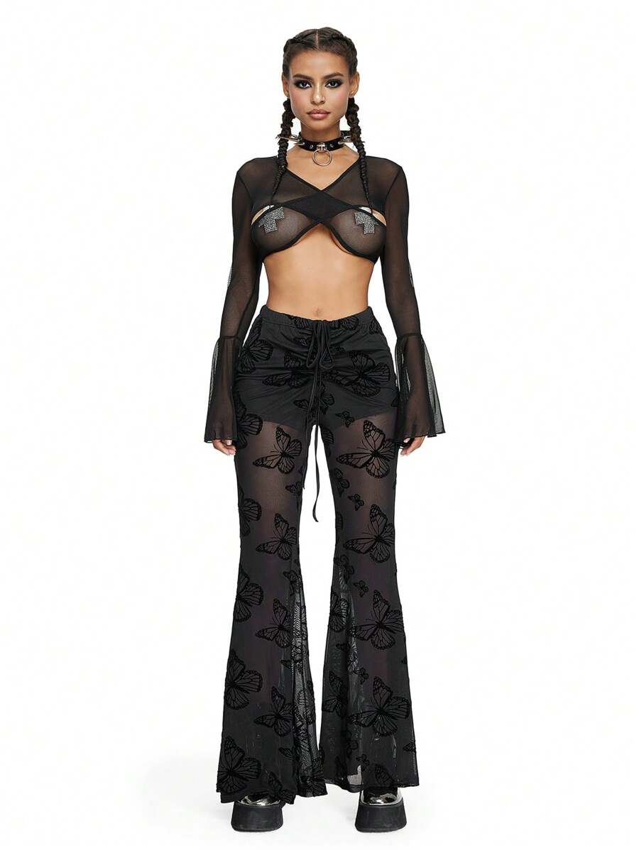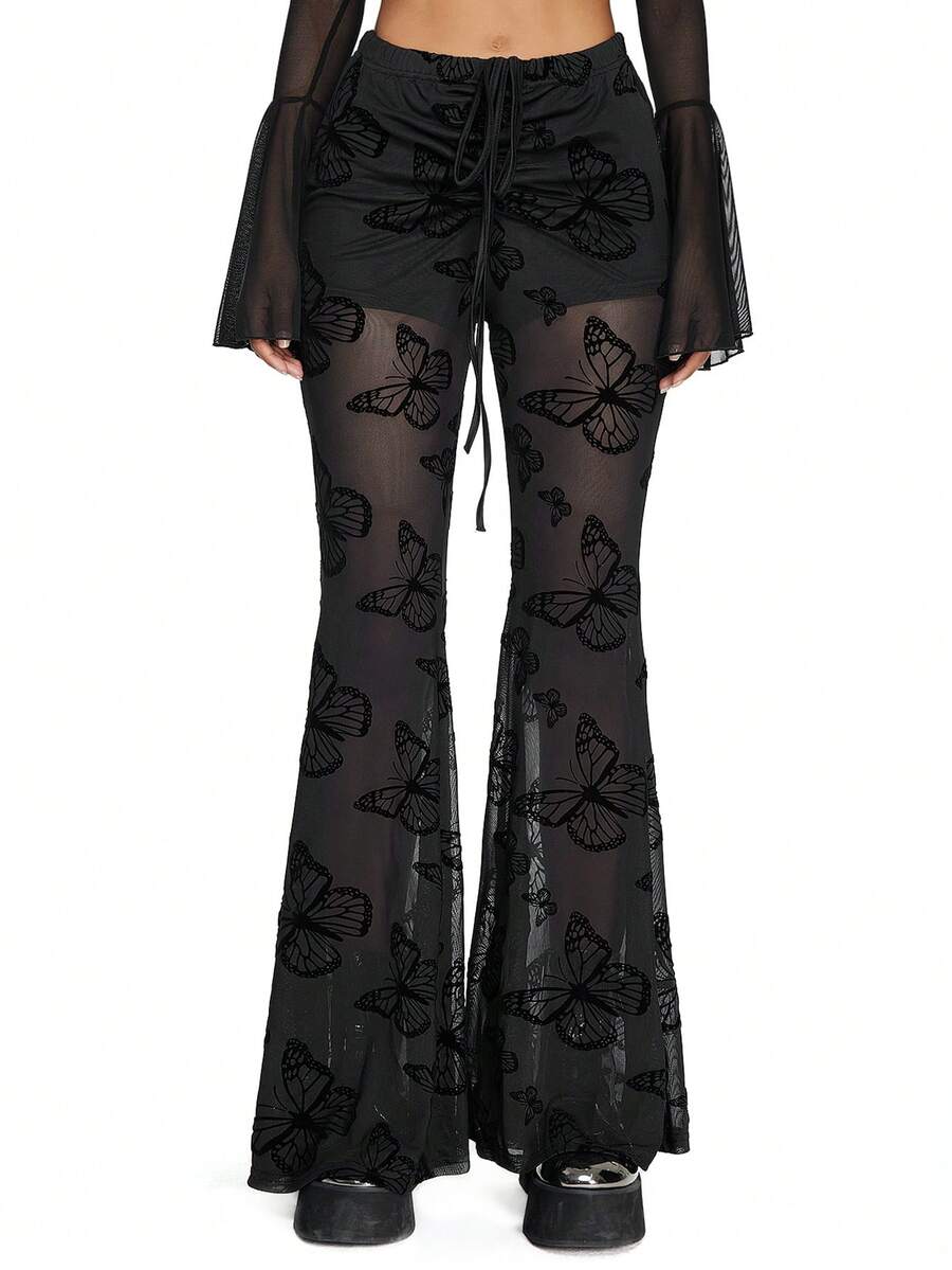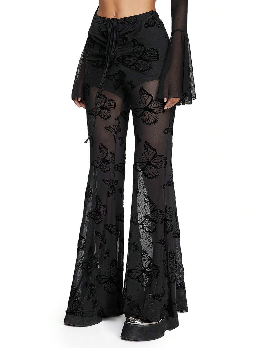 ROMWE Avant Pantalon évasé à lacets avec papillon en dentelle pour femmes sans ceinture, pantalon long exquis pour festival de rave
