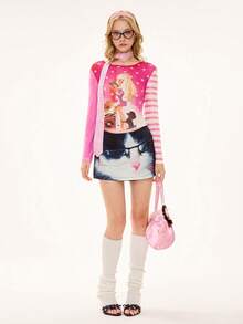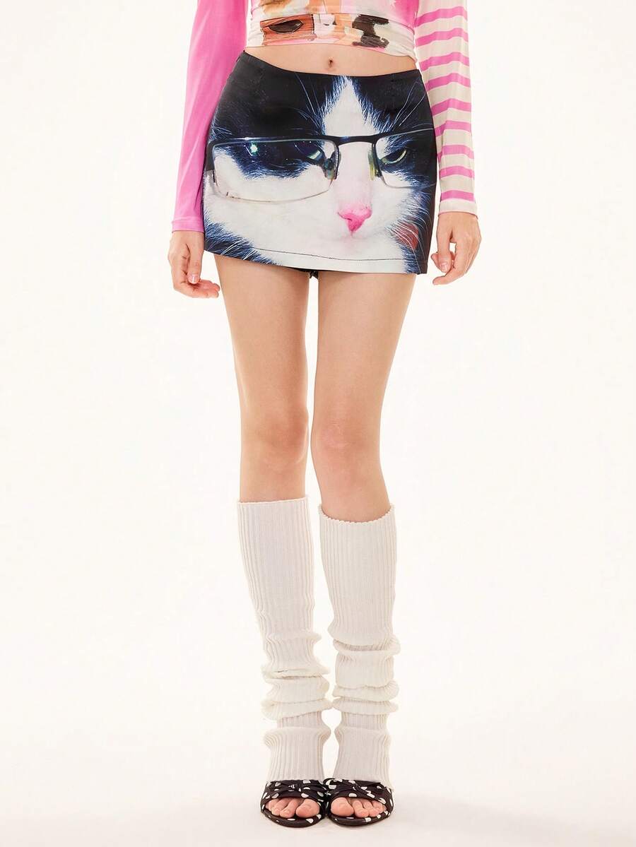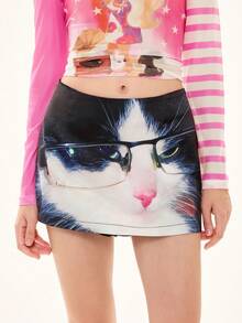 ROMWE Avant Jupe mini sexy à taille basse avec imprimé réaliste de chat mignon et bizarre Y2K pour femmes