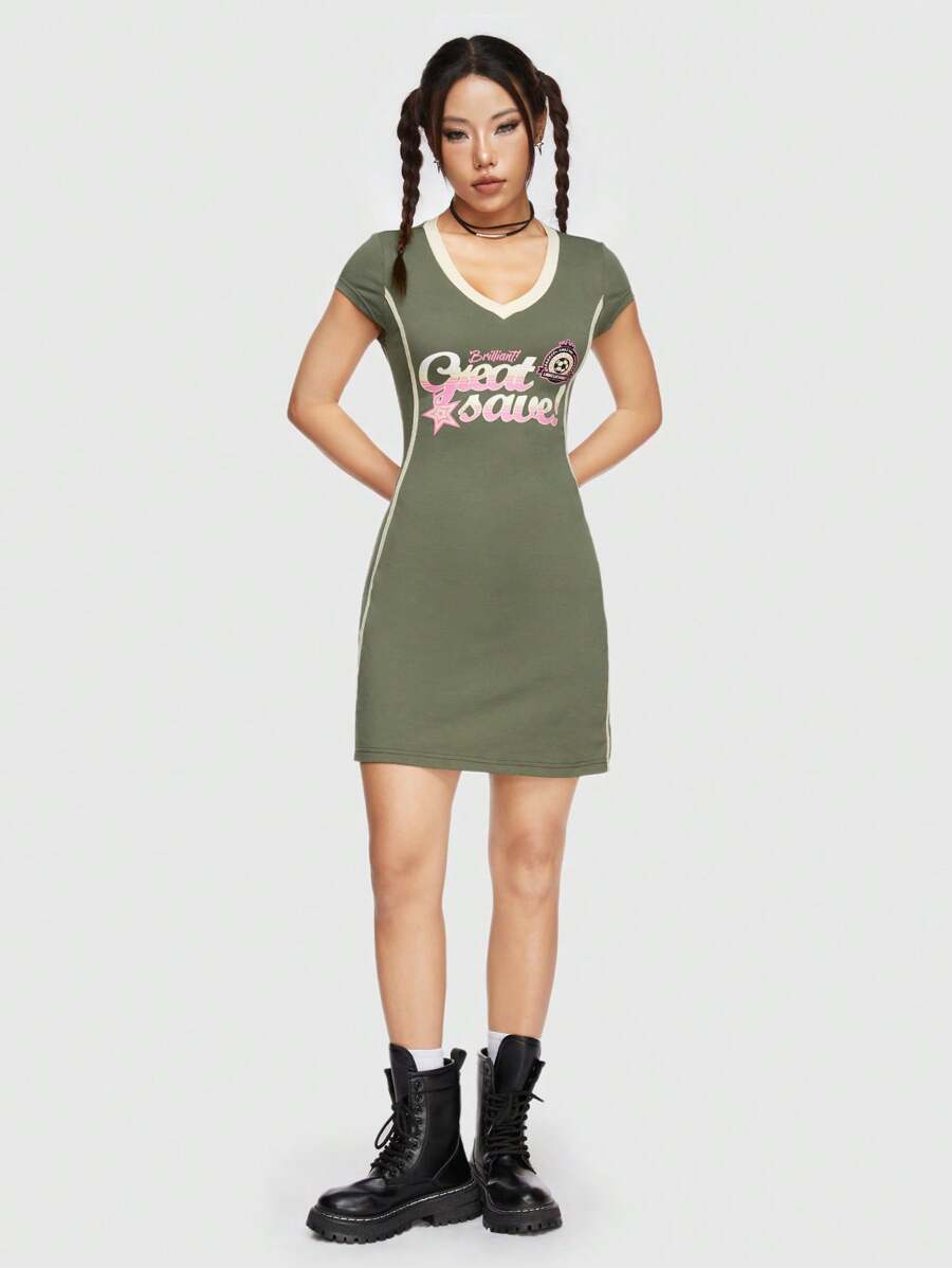 ROMWE Avant Robe À Manches Courtes Imprimée Avec Motif De Lettre Pour Femme