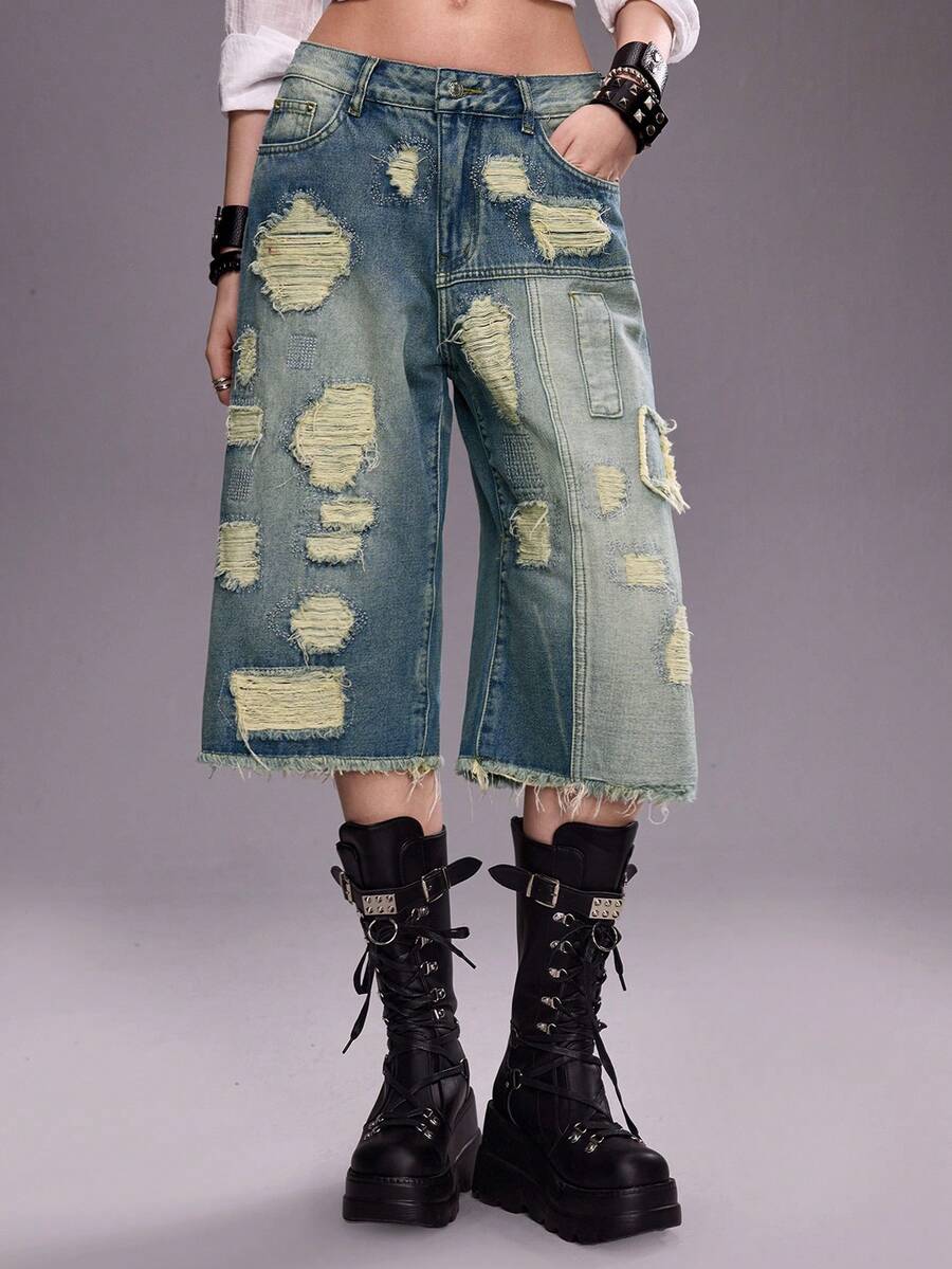 ROMWE Avant Jeans capri femme à taille basse, super ample, déchiré et patchwork