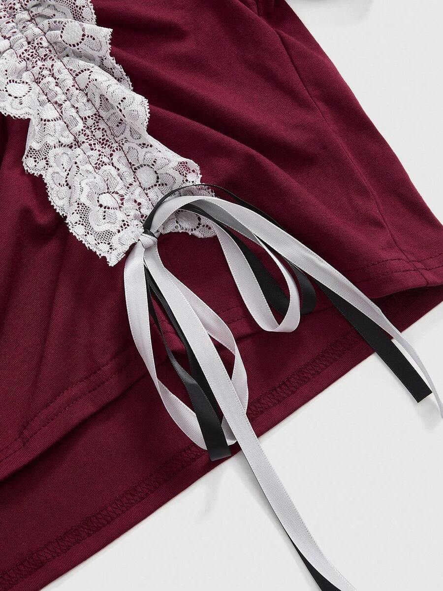 ROMWE Avant T-shirt court à col V avec broderie numérique, cordon de serrage et garniture en dentelle, style sportif rétro pour femmes