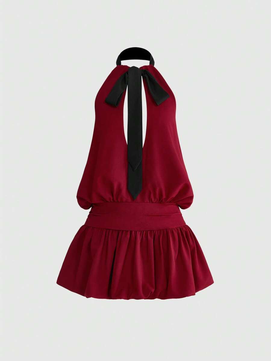 ROMWE Avant Robe mini volantée sexy à col en V avec nœud papillon et dos nu pour femmes