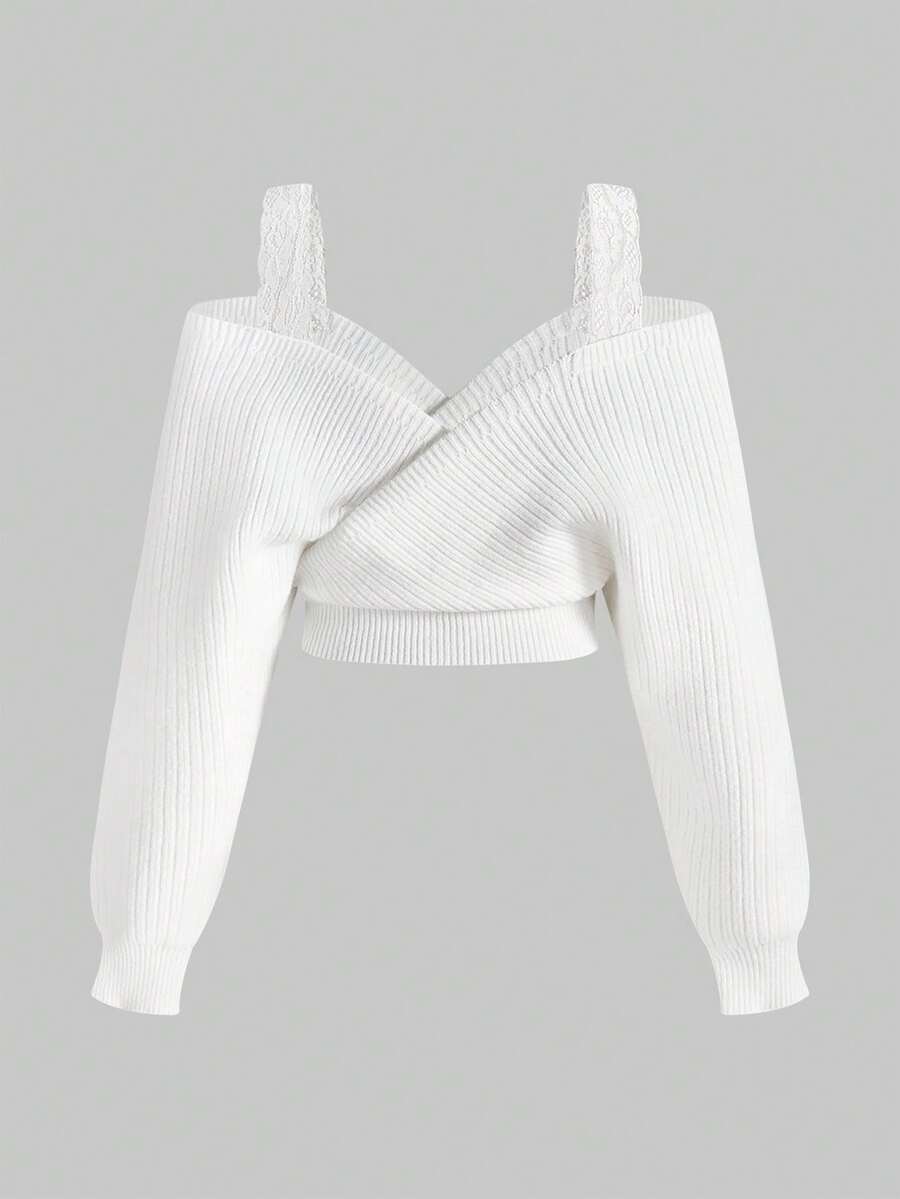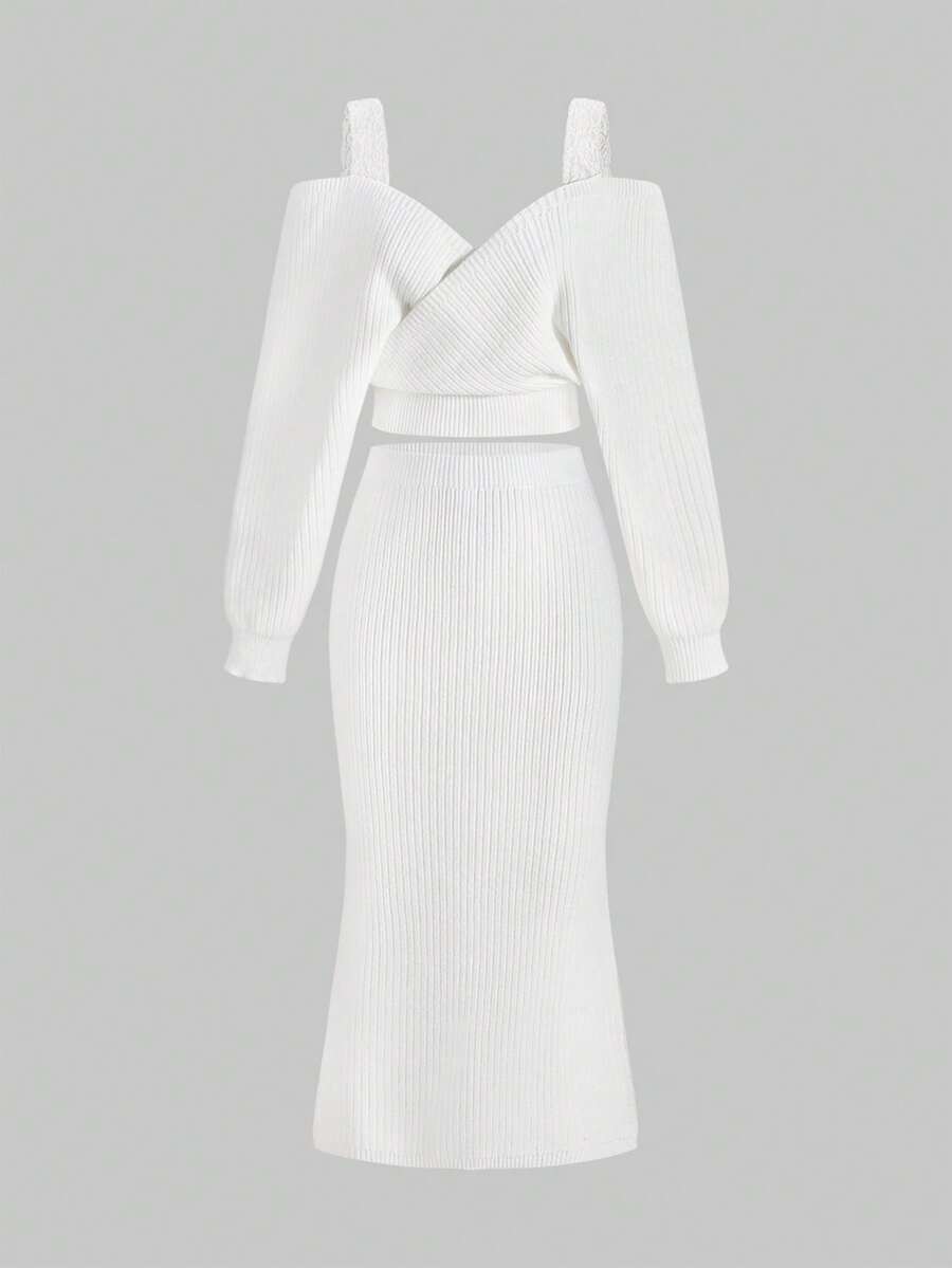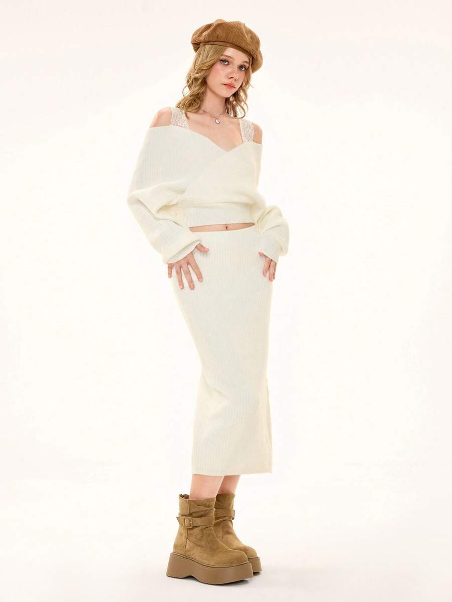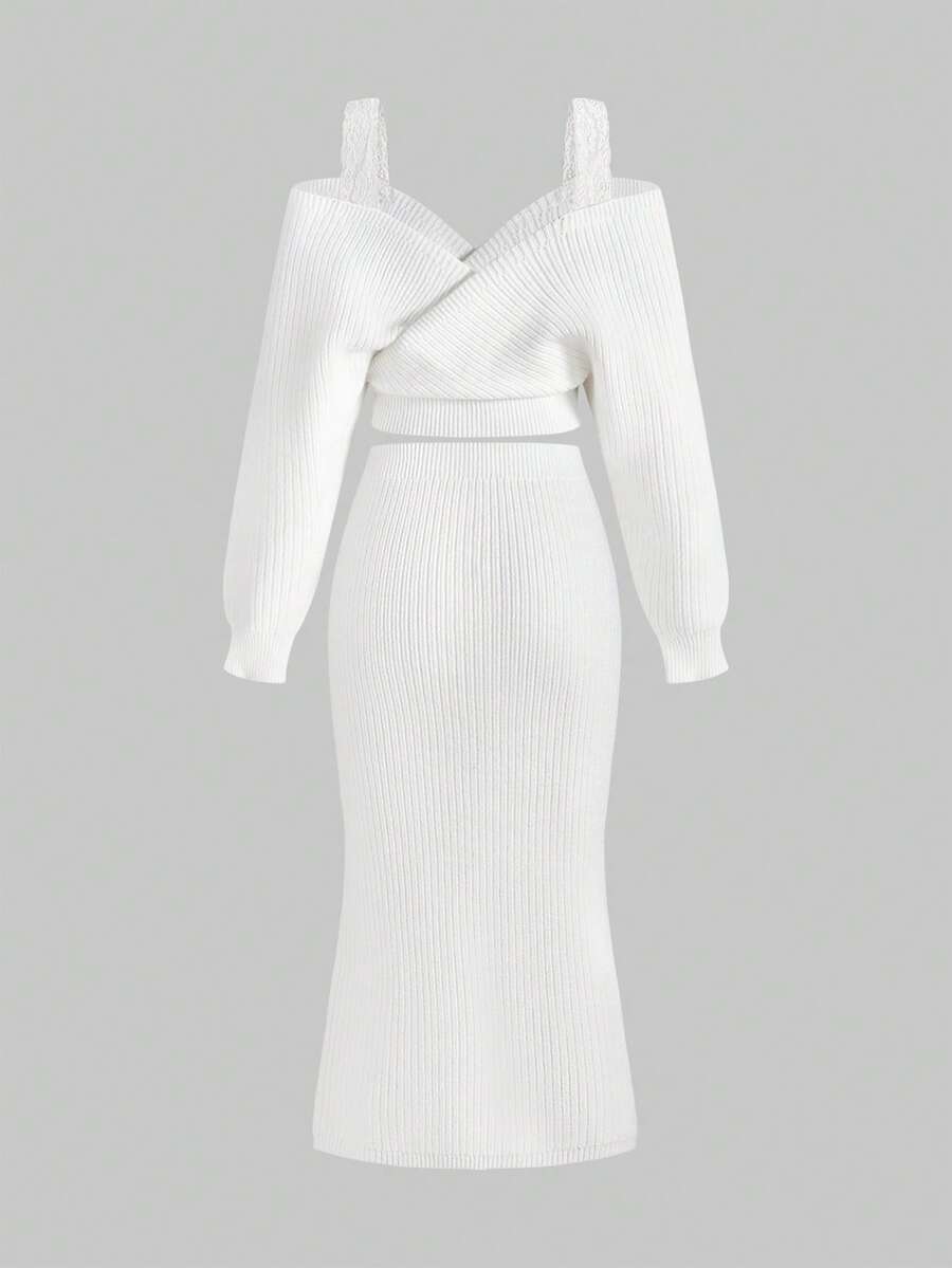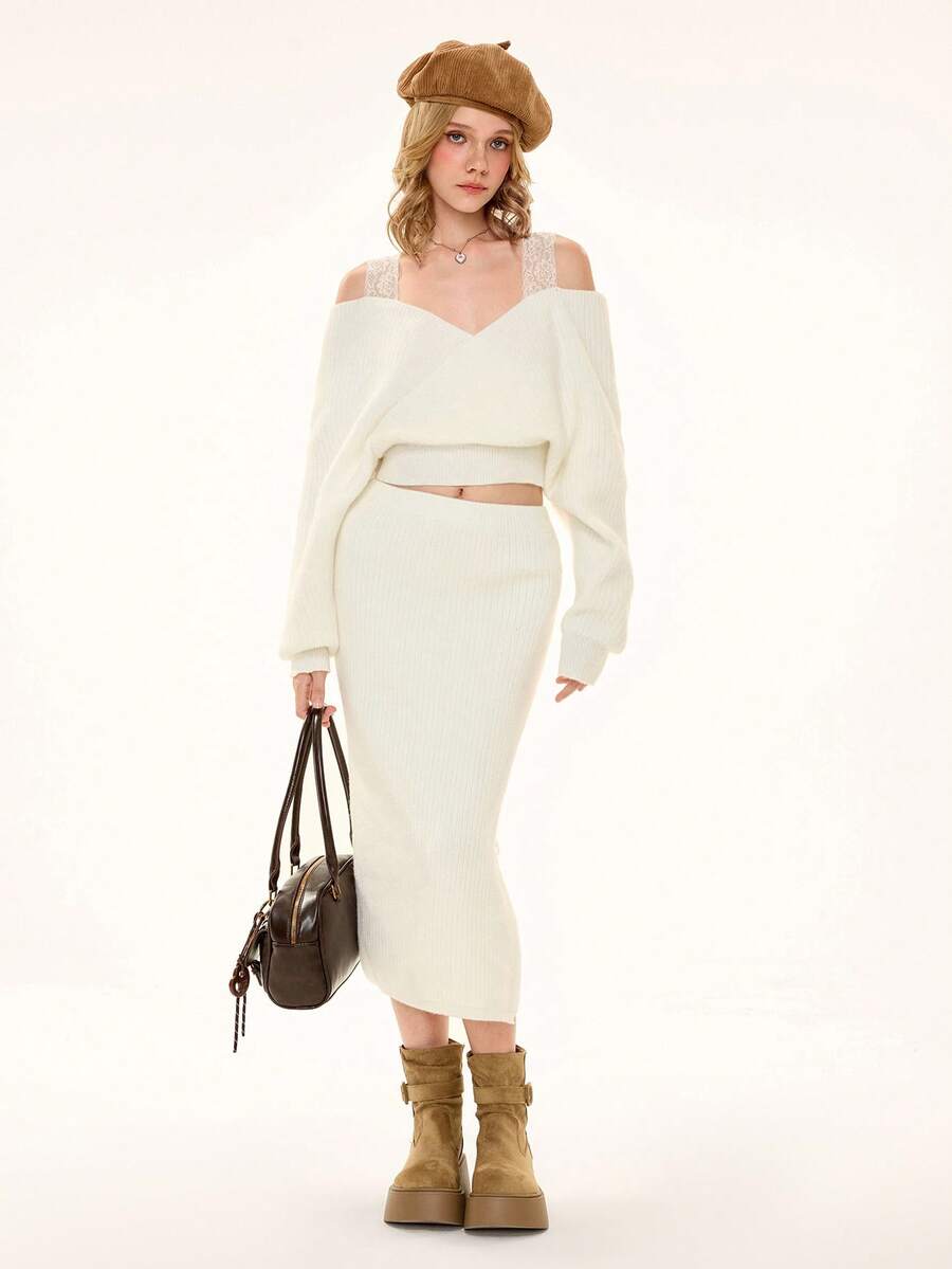 ROMWE Avant Ensemble de 2 pièces : pull sexy à manches longues avec bretelles épaisses et décolleté plongeant, épaules dénudées, en dentelle, style décontracté français, associé à une mini-jupe moulante