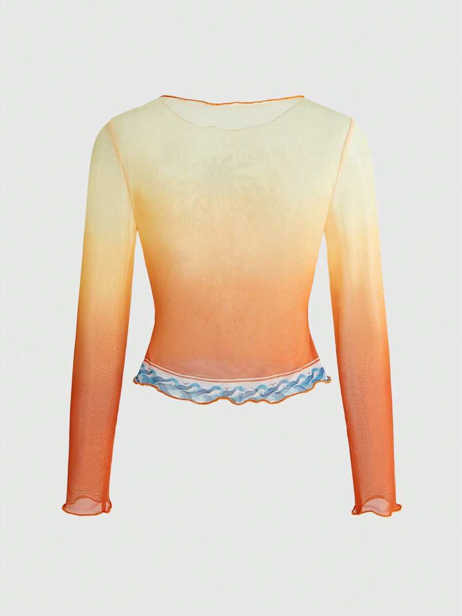 ROMWE Avant Blouse transparente avec imprimé dégradé de palmiers et coucher de soleil, style vacances pour femmes