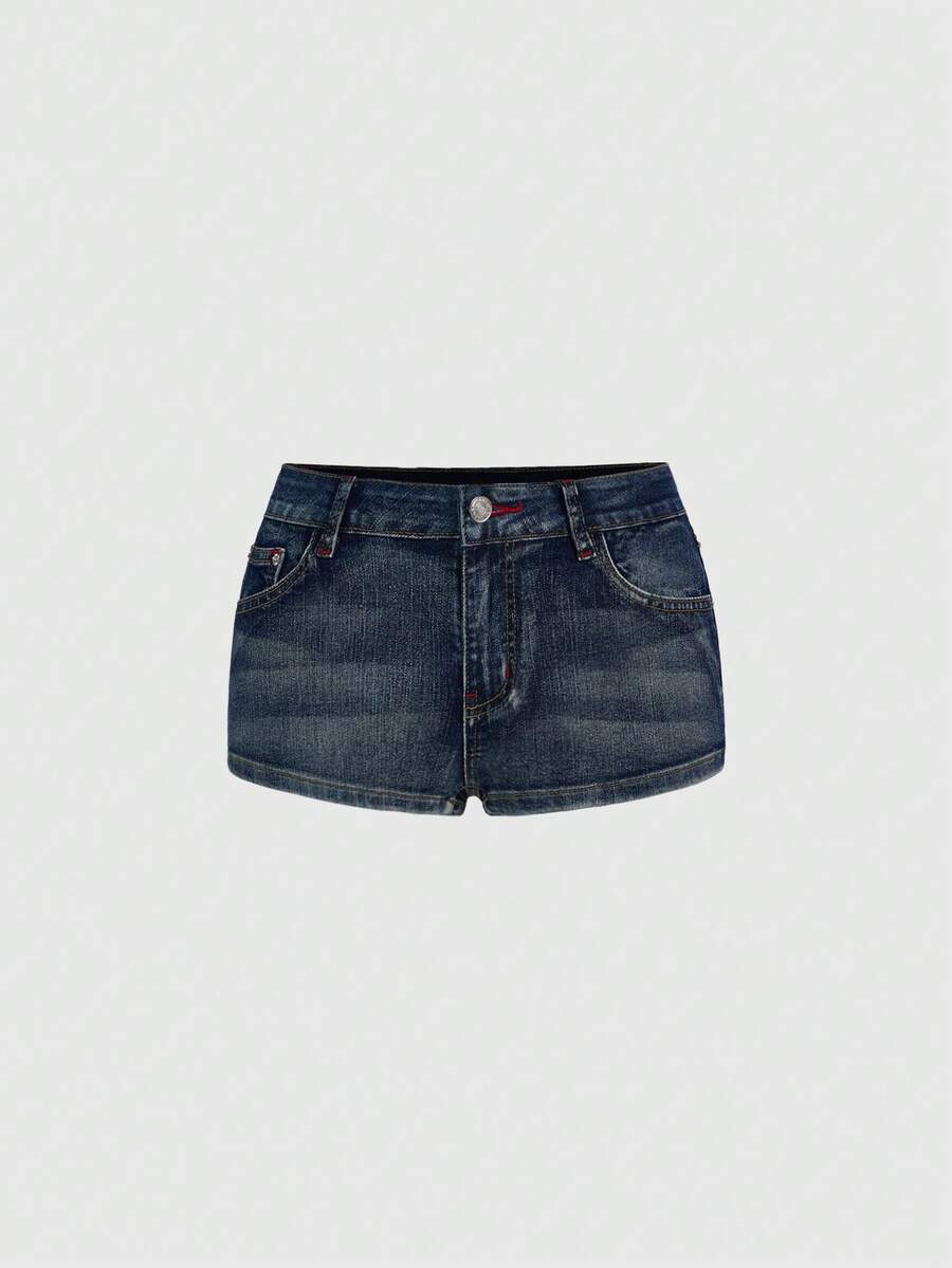 ROMWE Avant Short en jean taille basse sexy pour femmes avec poches pomme brodées, taille basse