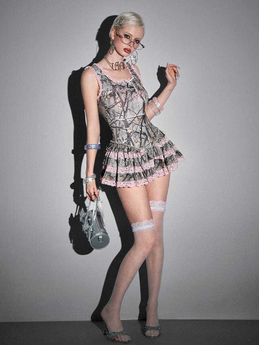 ROMWE Avant Robe mini taille très basse avec dentelle et maille de style camouflage Y2K pour femmes