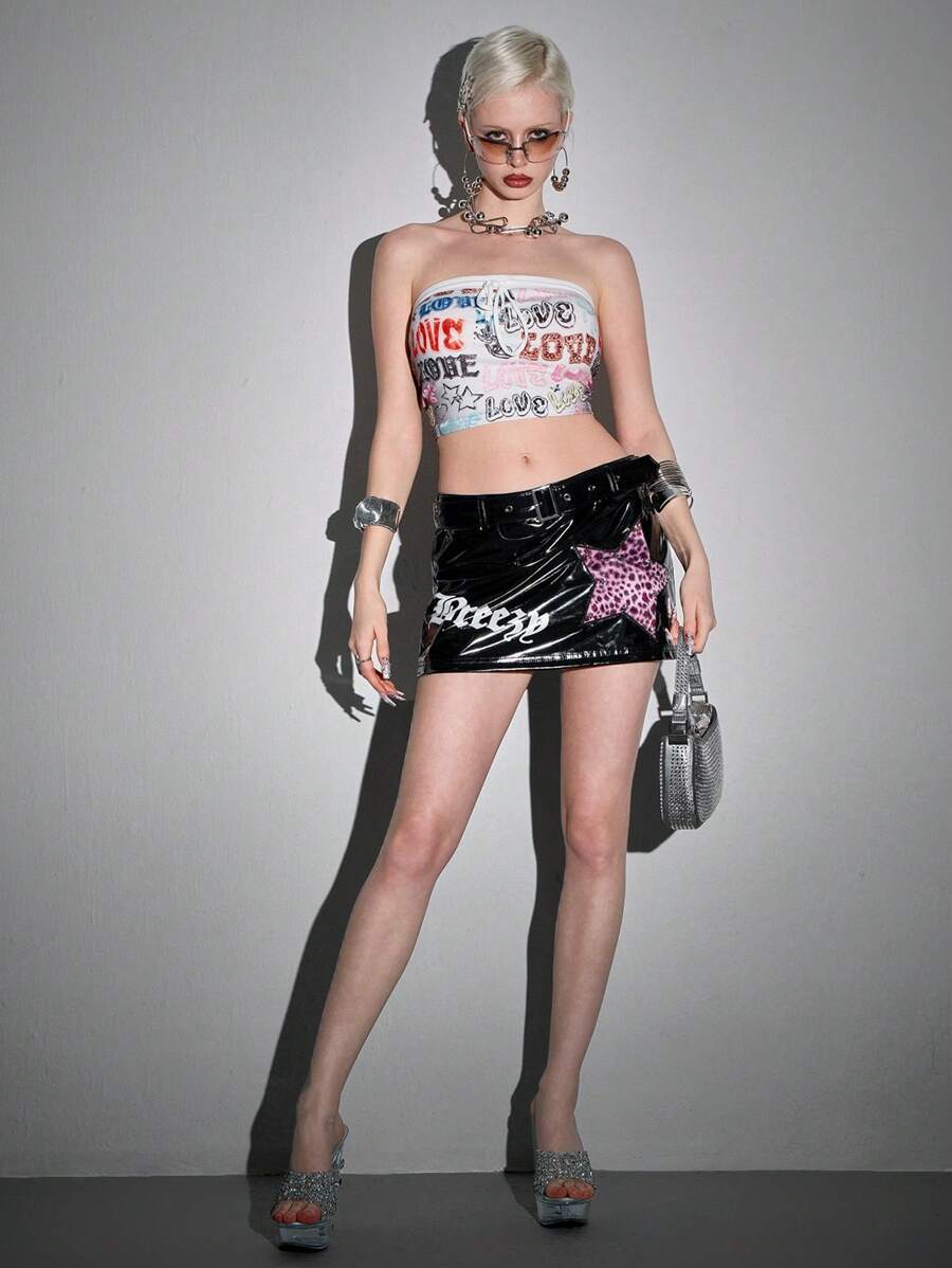 ROMWE Avant Jupe courte à taille basse imprimée d'étoiles et de léopard, sous-culture Y2K