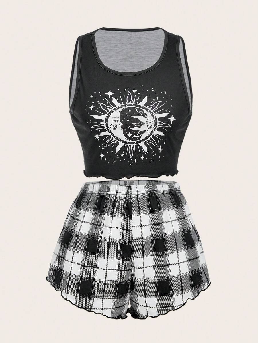 Academia Ensemble De Pyjama Soleil Et Lune À Carreaux À Ourlet Ondulé