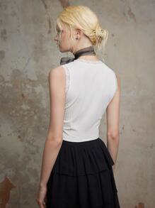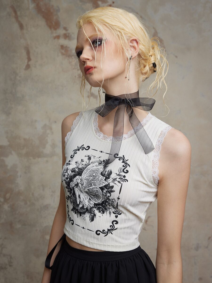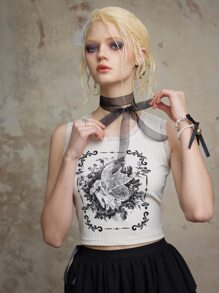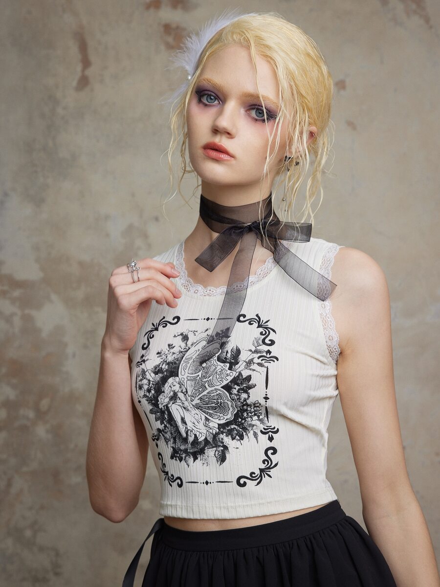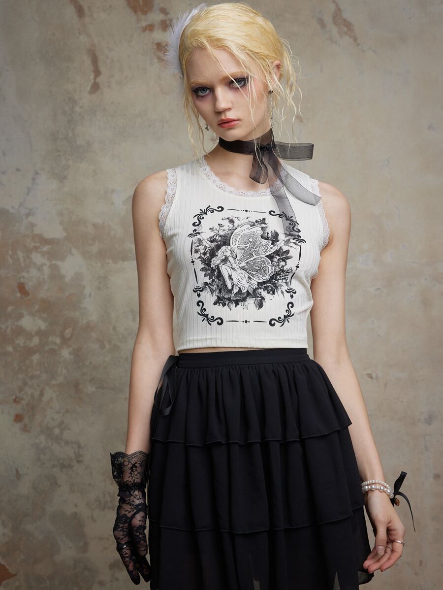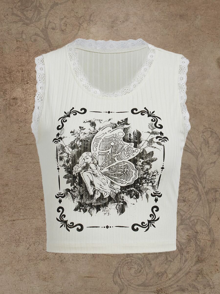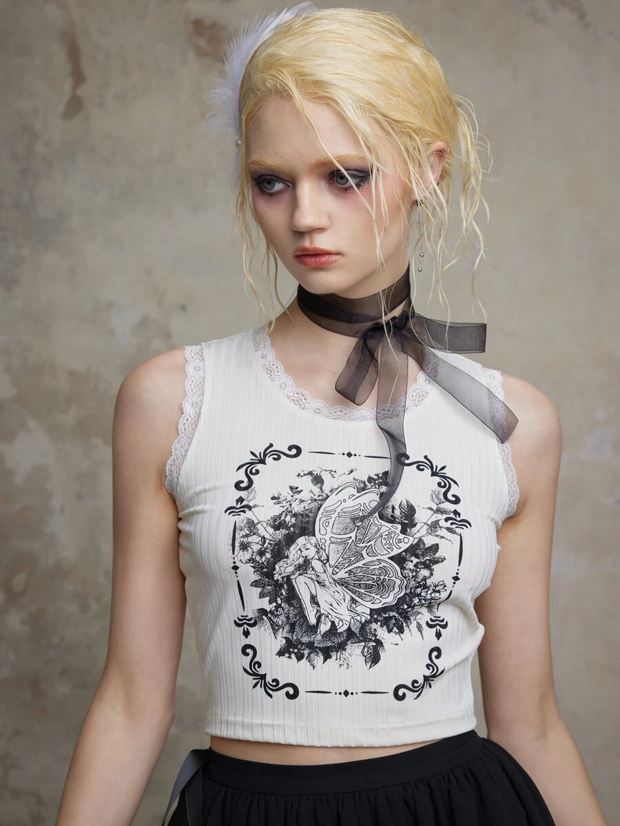 Fairycore Top sans manches à imprimé figure ourlet en dentelle