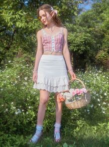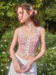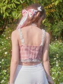 Fairycore Top À Fines Brides Court À Carreaux À Crochet En Dentelle
