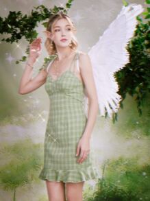 Fairycore Robe à carreaux à épaule nouée à volants