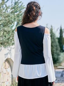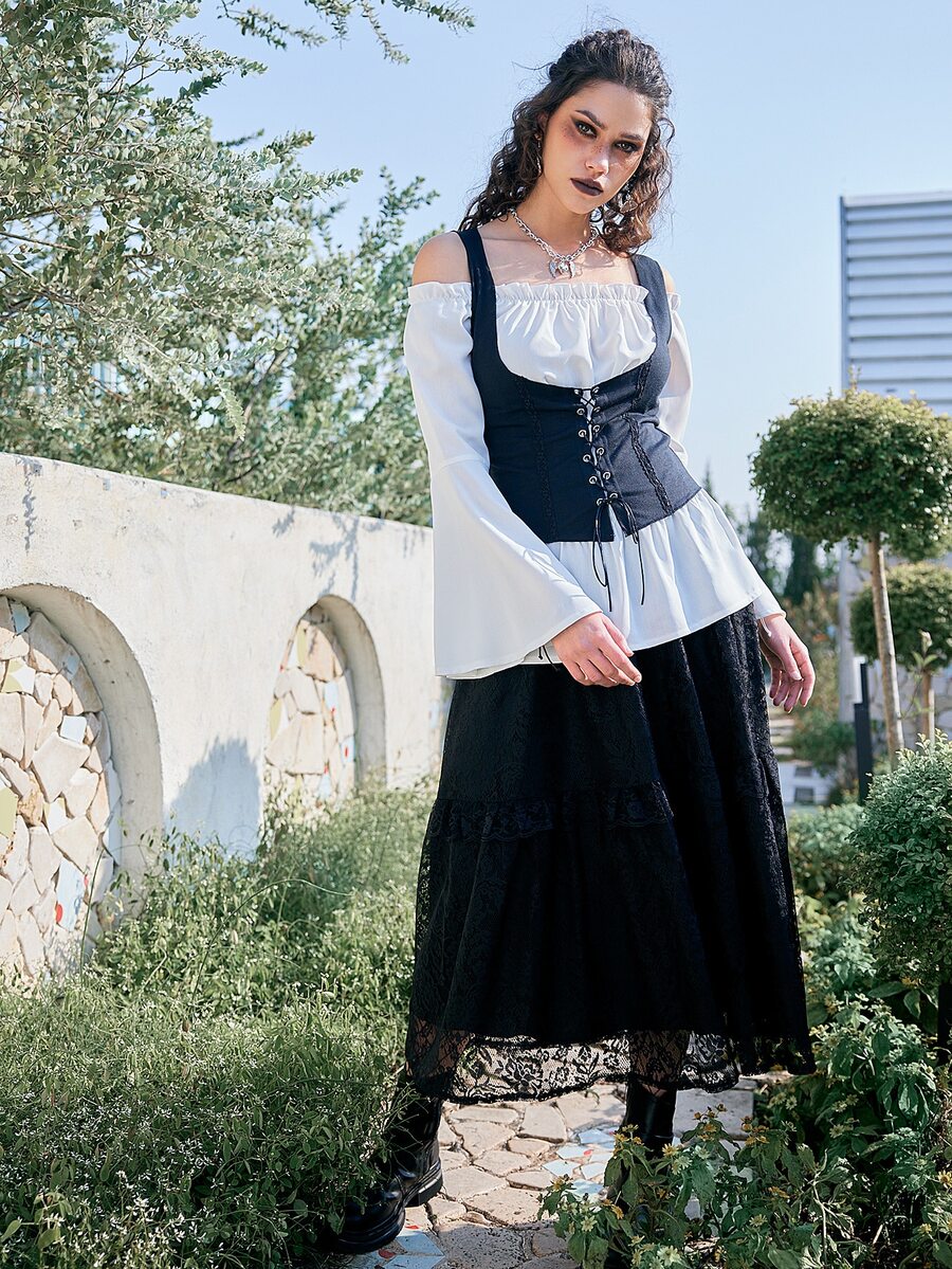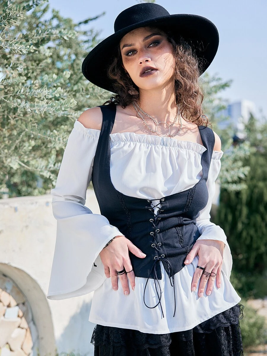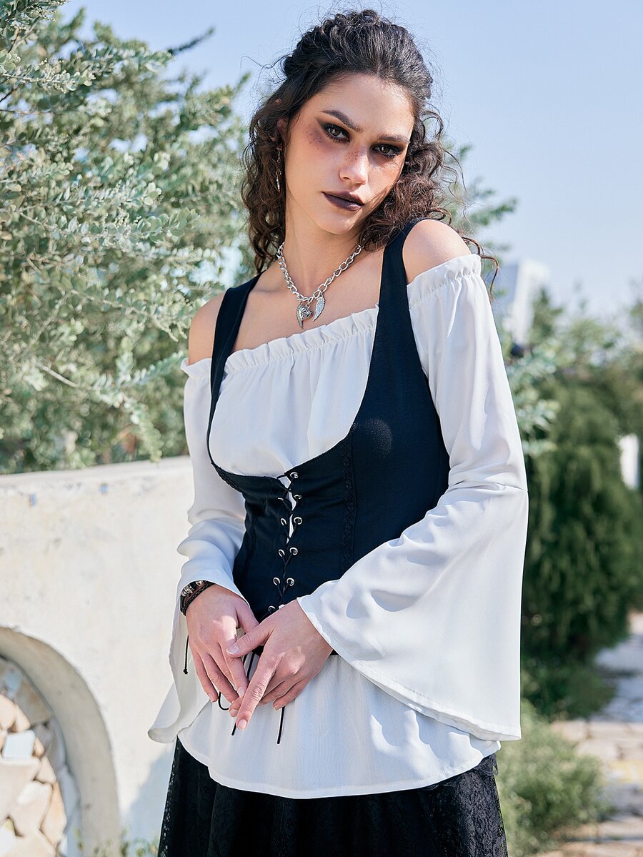 Goth Col Bardot Manches Évasées Top & À Lacets Top Sans Manches
