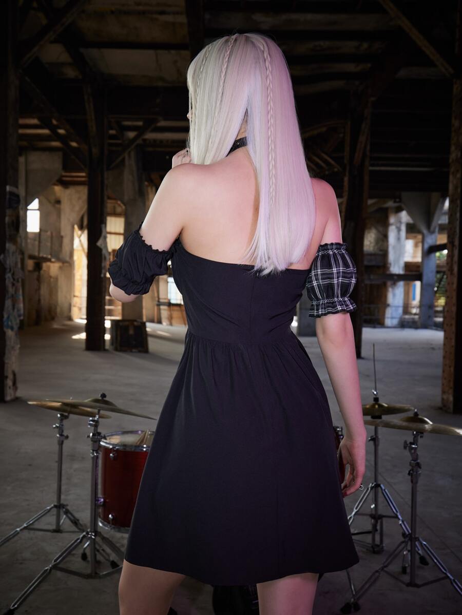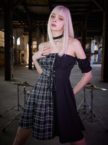 Grunge Punk Robe à blocs de couleurs à carreaux col bardot