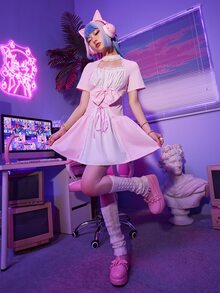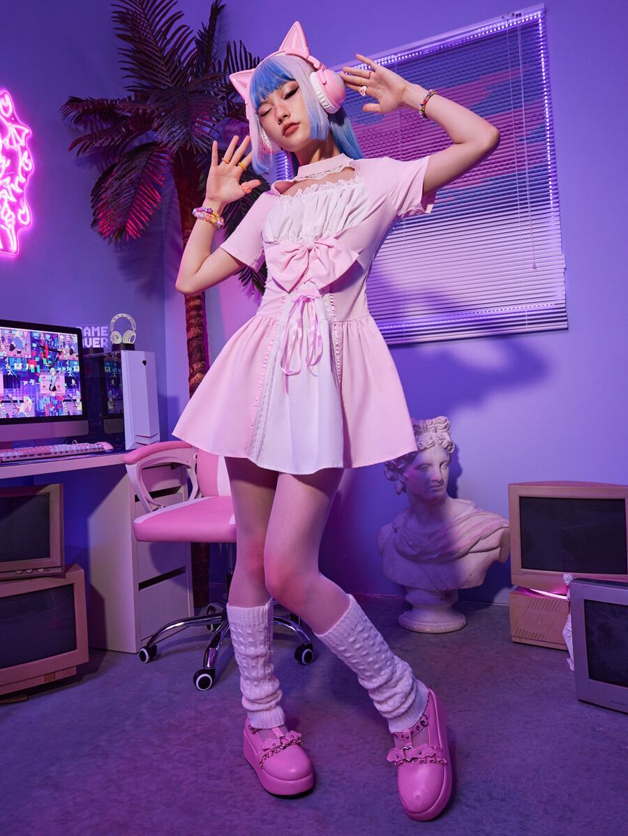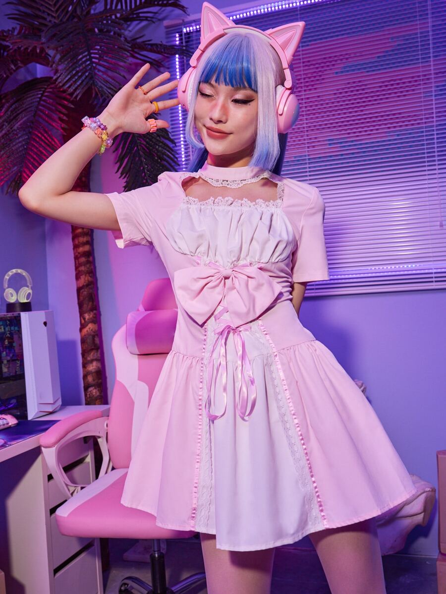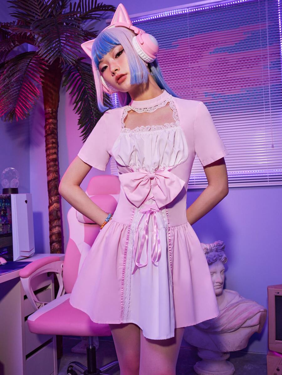 Kawaii Robe à blocs de couleurs à lacets à nœud à ruchés