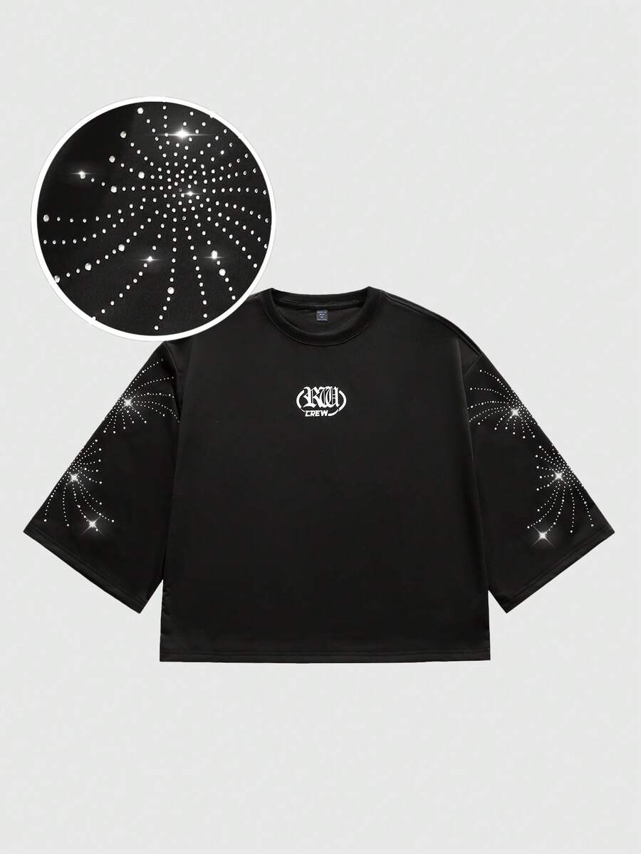 T-shirt décontracté à col rond noir avec manches 3/4 orné de strass