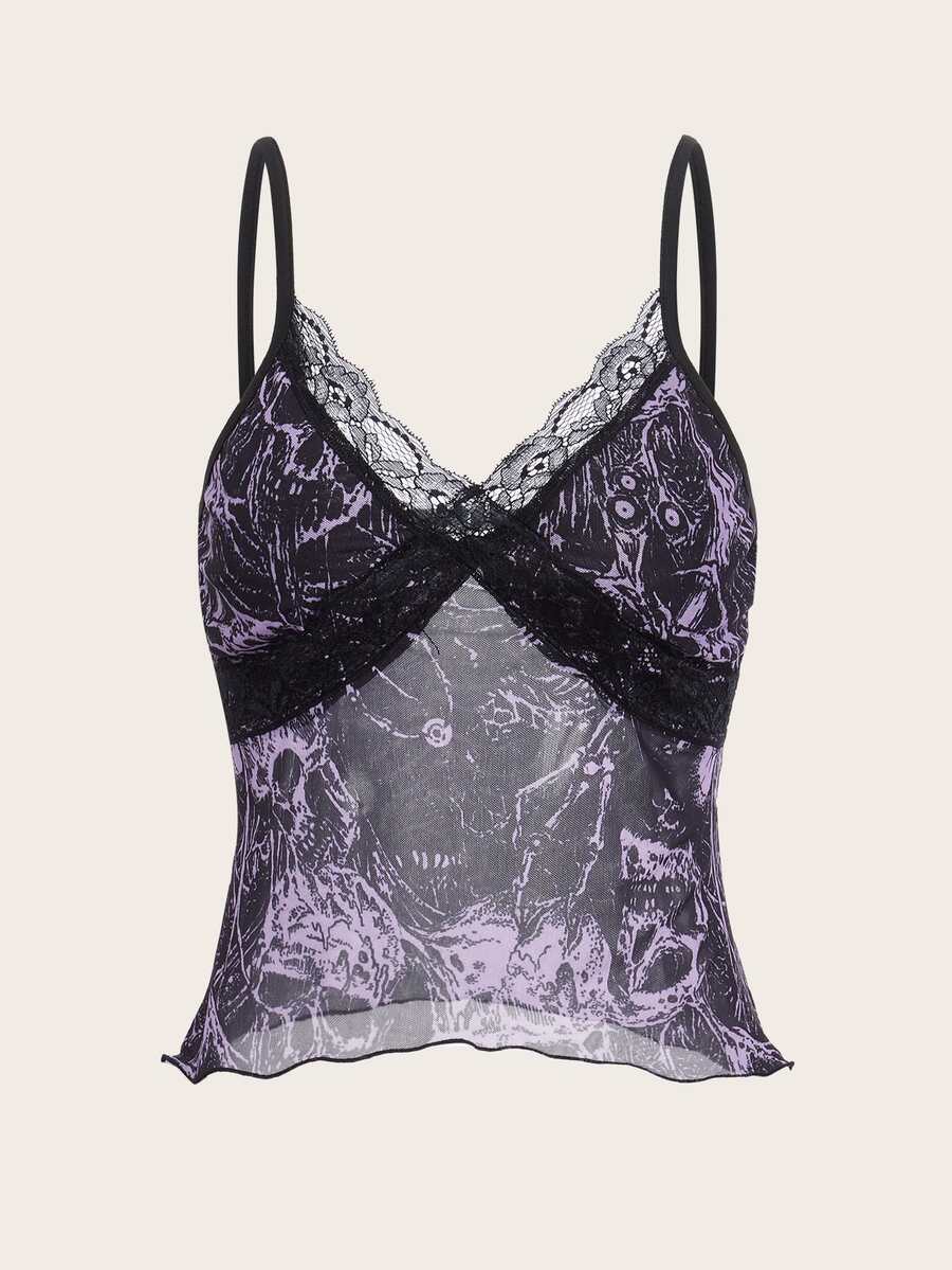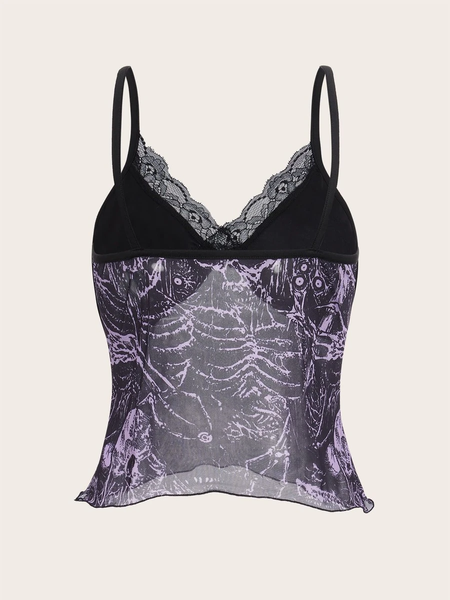 Top à fines brides à imprimé tête de mort en dentelle en tulle