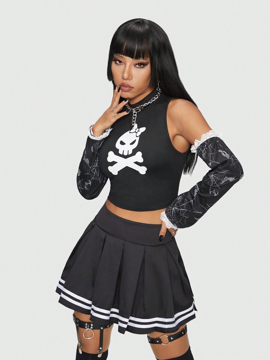 Kawaii Top Court Imprimé Tête De Mort Avec Manches De Bras